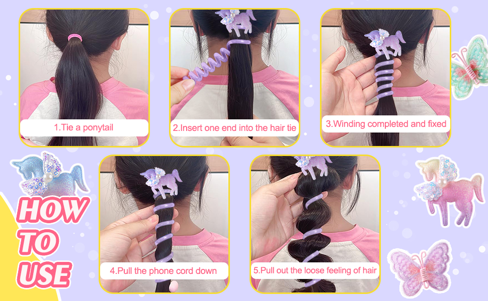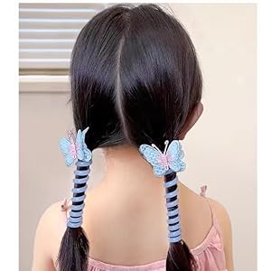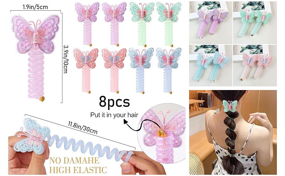 - ã€Different and Unique】Telephone wire hair ties makes an ordinary Braid to a fun hair style,help little girls playing dress up or wanting to add color and fun to their hair styles.also can use the ponytail holder for dressing up dolls.The color butterfly spiral hair ties design of these hair bands makes it easy to wrap around ponytail hair and ensure it in place without causing creases or kinks in the hair.