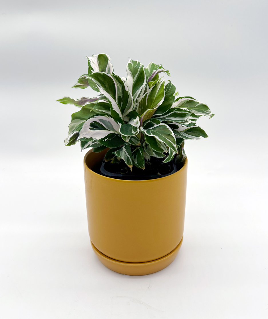 The Calathea White Fusion is a truly captivating and elegant indoor plant, admired for its stunning variegated leaves that feature a striking blend of white, green, and pale purple hues. This rare and exotic plant is a favorite among plant enthusiasts for its unique foliage and relatively easy care requirements. The Calathea White Fusion adds a touch of tropical sophistication to any space, making it an ideal choice for those who appreciate ornamental plants.