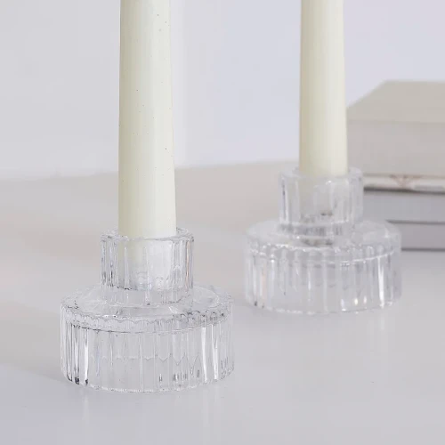 2 x Ribbed glass candle holders, measuring 6.5cm (H) x 4.8cm (D).