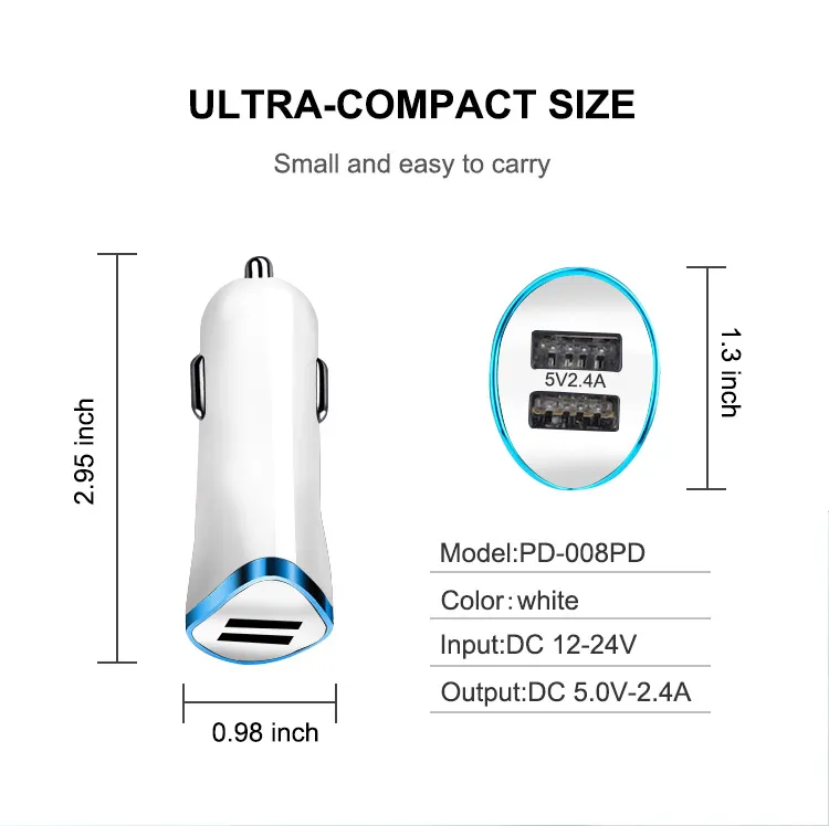 The Car Charger with Dual USB is designed to fit into your vehicle's cigarette lighter socket without taking up too much space. Its compact size ensures that it doesn’t interfere with other car functions or create clutter in your car. This makes it ideal for use in any vehicle, whether it’s a small compact car or a larger SUV.