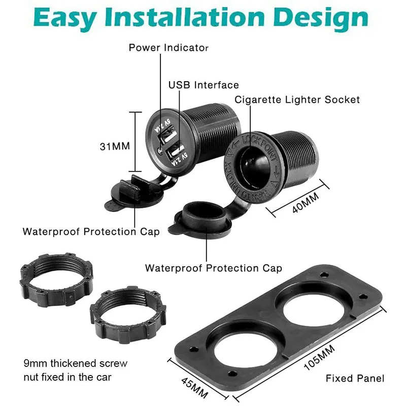 Fits for 12-24V Car, Boat, Marine, ATV, RV, etc. The USB socket with dual output 5V/2.1A charging port, Suitable for charging mobile phones, GPS, digital cameras, PDAs and other USB accessories. The 12V power outlet works with any standard cigarette lighter plug or lockable marine plug.