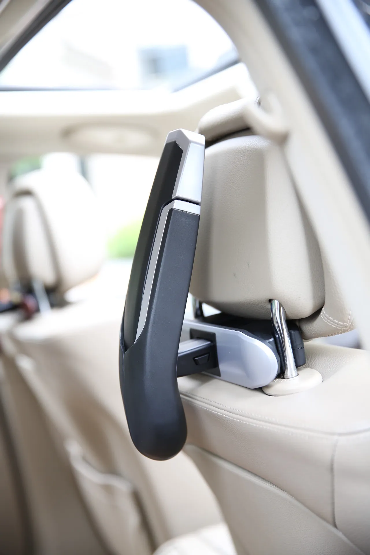 - Rubberized or padded hooks prevent scratches on headrest poles.