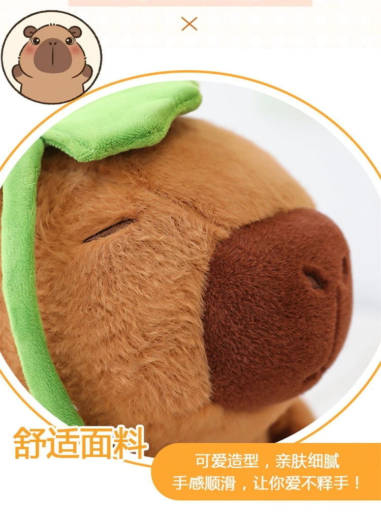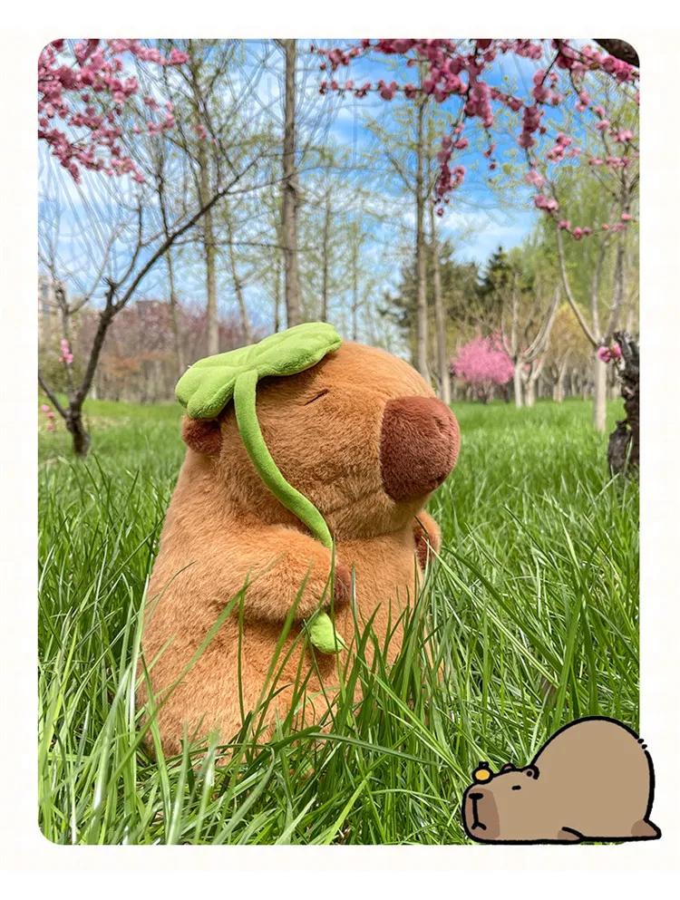 features a charming capybara, one of the most beloved animals in the world of plushies, complete with a cartoon lotus leaf on its back. This