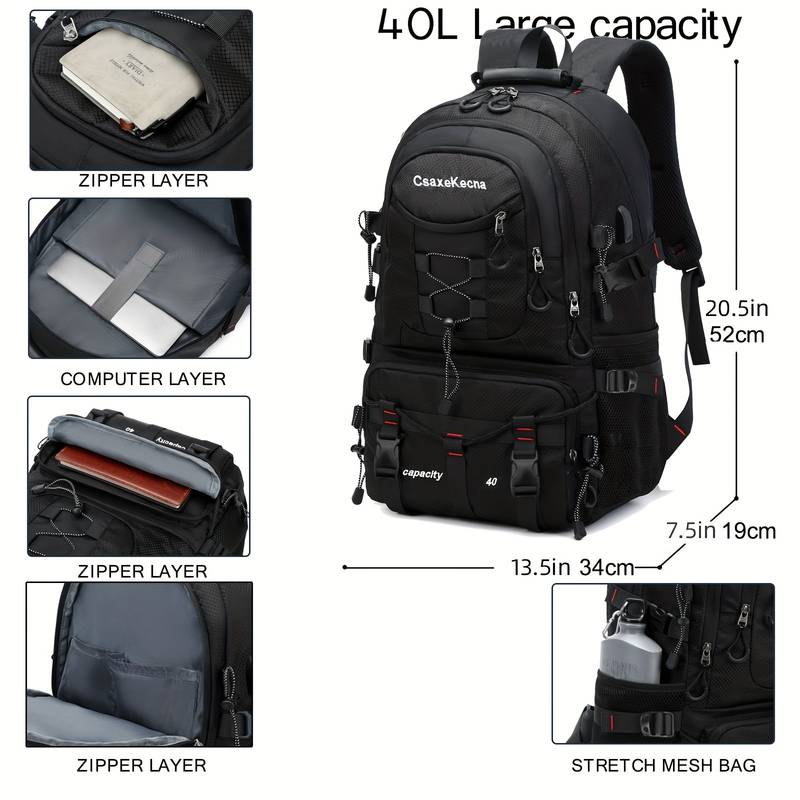 CASAKECNA Large 40L Travel Backpack with Laptop Compartment Durable and Functional Backpack for Hiking, Camping, and Travel