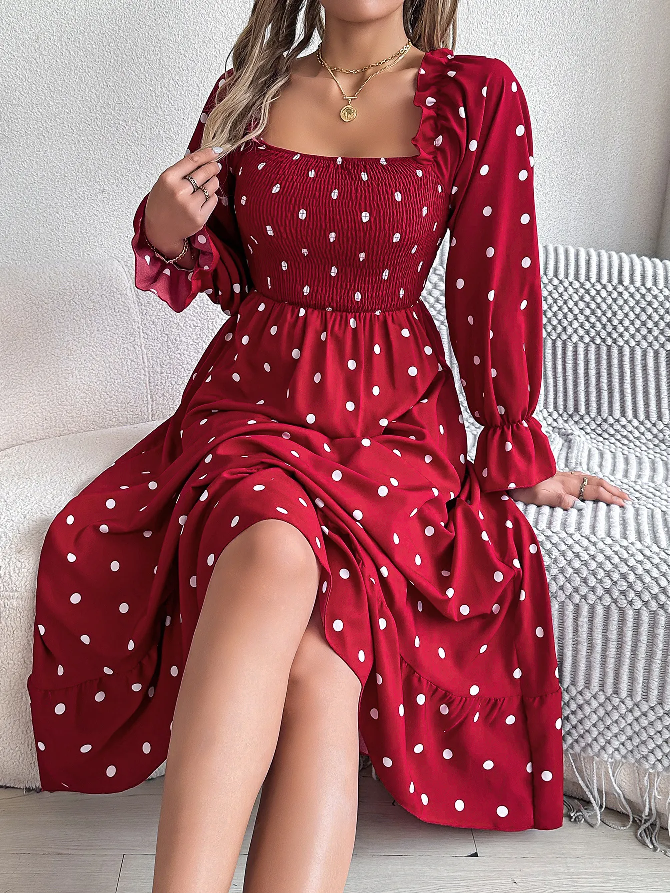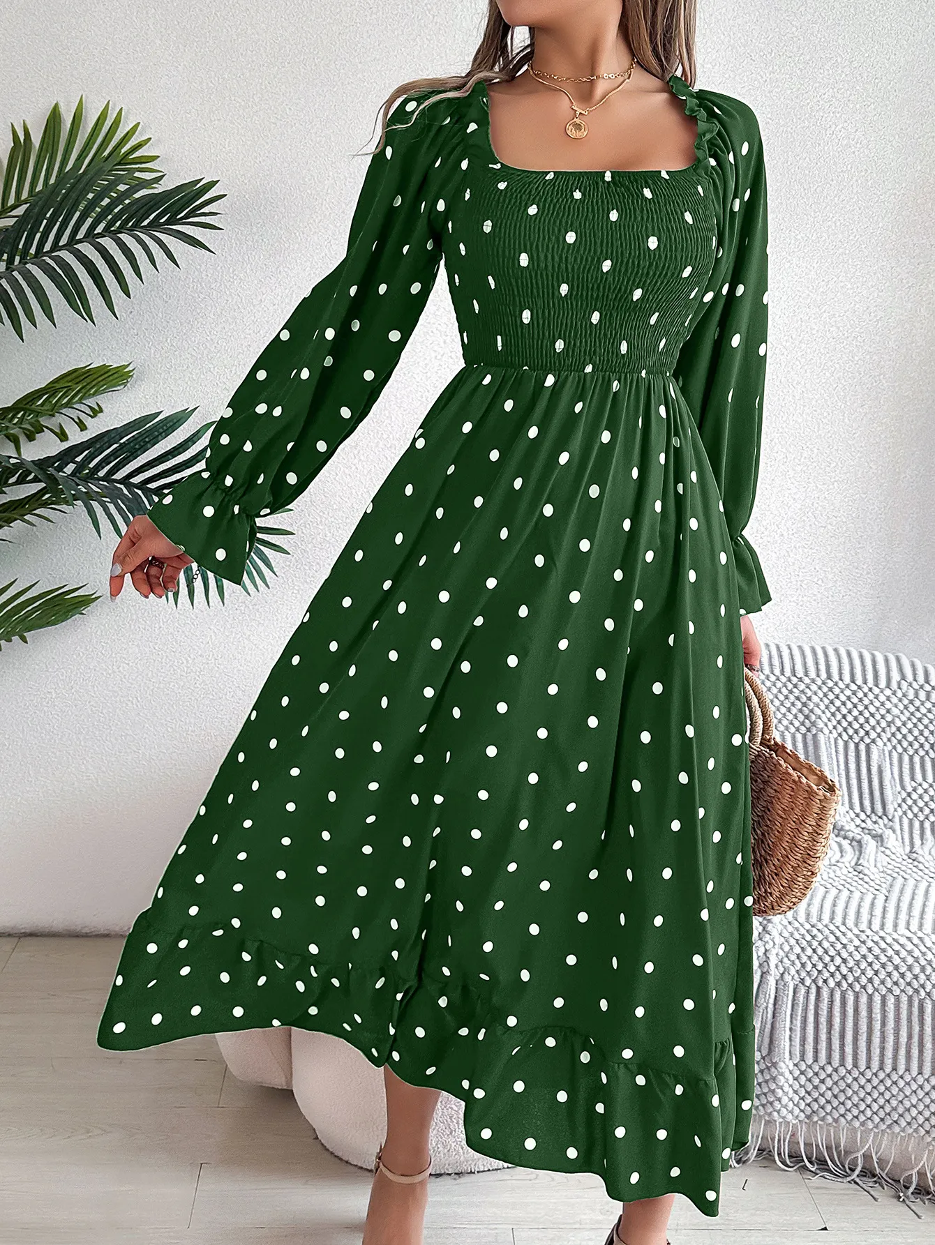 Casual Square Collar Polka Dot Swing Dress With Wooden Ears