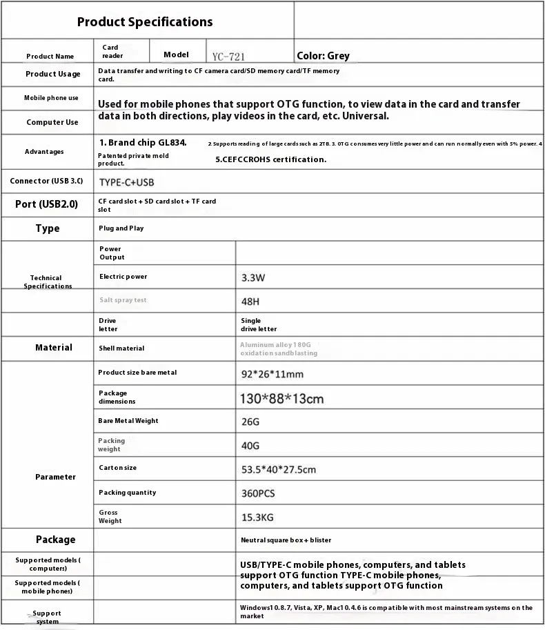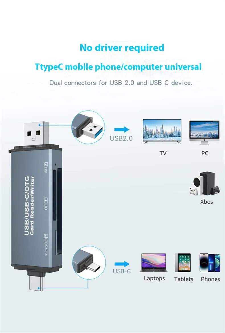 The CF Card Reader SD Card USB Three-in-One is the perfect solution for anyone who needs fast, reliable, and versatile data transfer capabilities. Whether you're a photographer looking to transfer images from a CF card, a videographer working with SD cards, or just need an easy way to move files from a USB drive, this card reader has you covered. With its high-speed data transfer, compact design, and wide compatibility, it’s an essential tool for professionals and casual users alike.