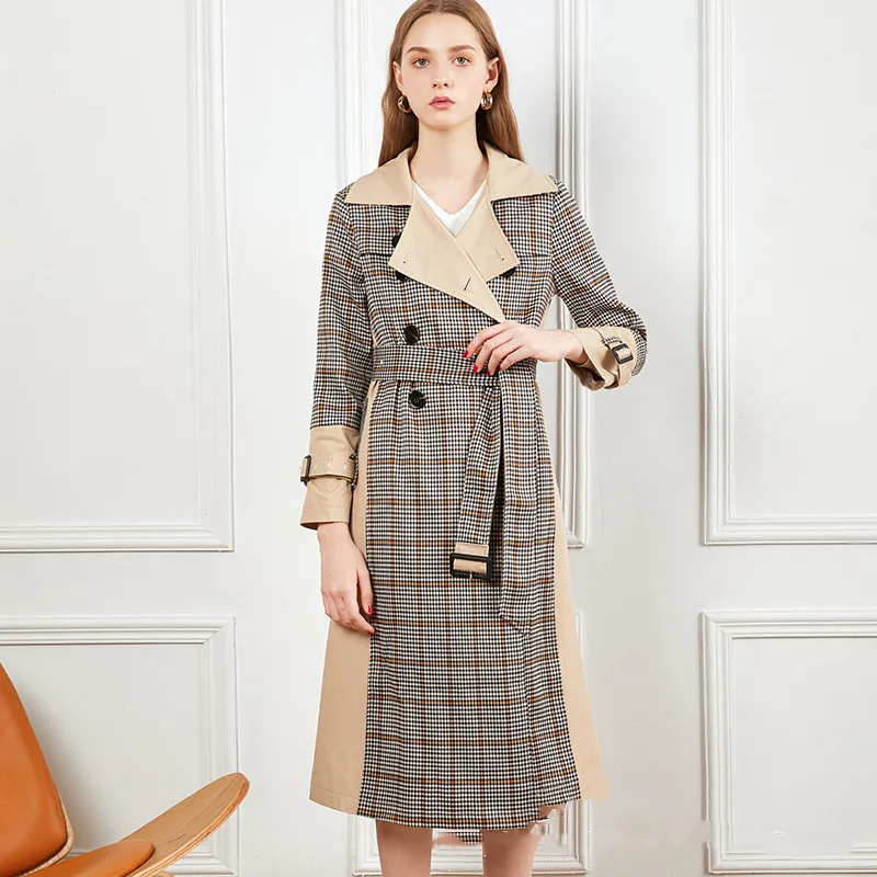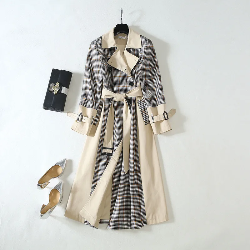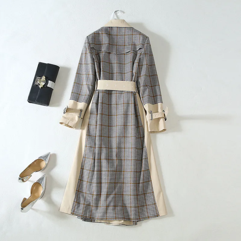 Key Features of the Checked Stitching Lace-Up Waist Long Trench Coat: