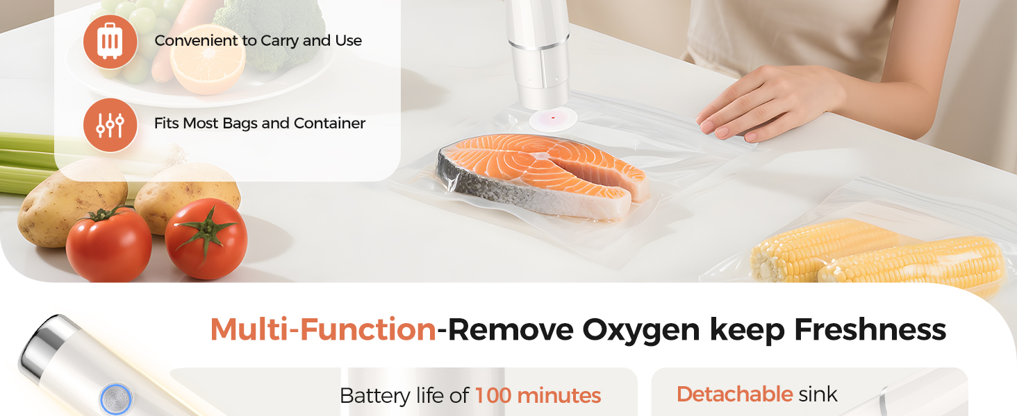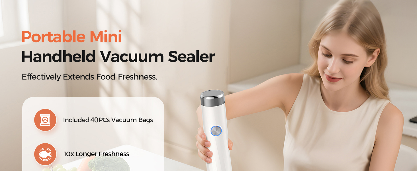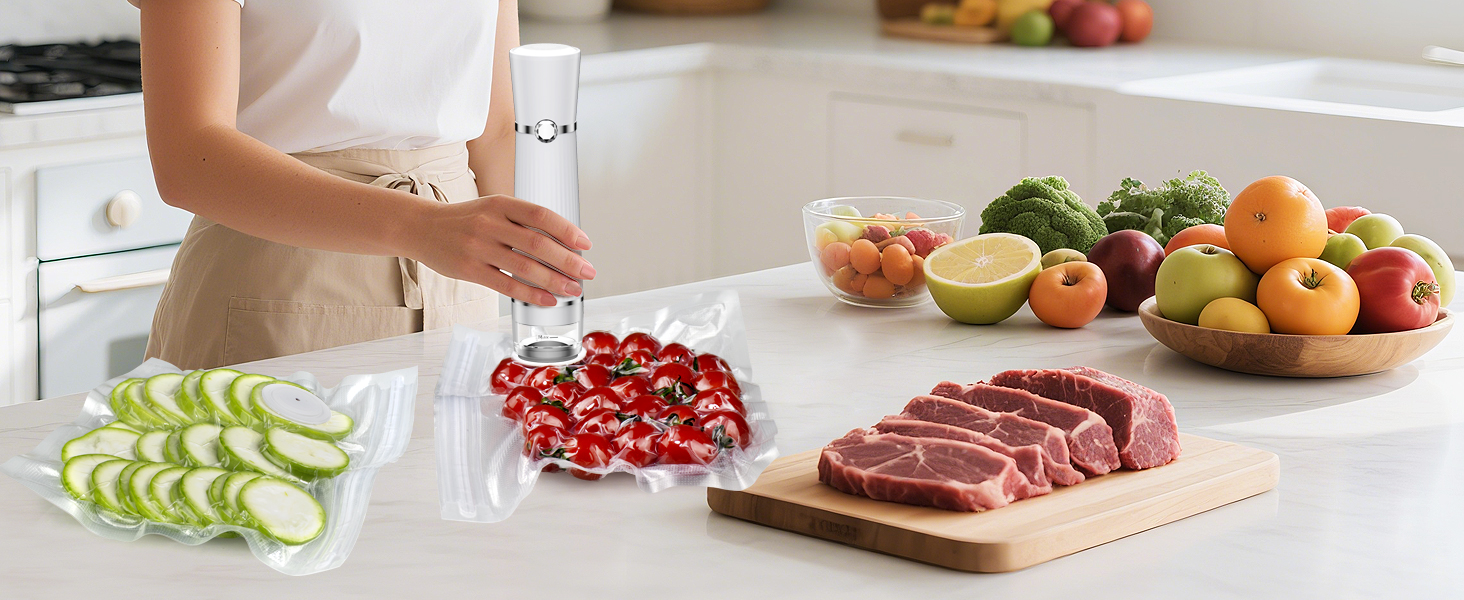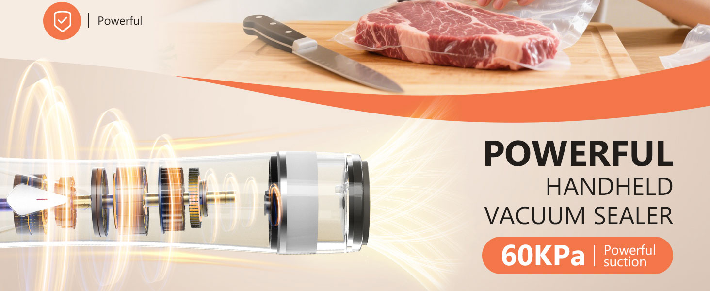 - SAVE SPACE, EASY TO USE: Old vacuum sealers take up tons of space in the kitchen, not to mention the huge disposable plastic rolls and waste. This handheld food vacuum sealer is the size of a pepper mill, easy to use, rechargeable, portable, and cordless, and is a great way to become an integral part of your kitchen