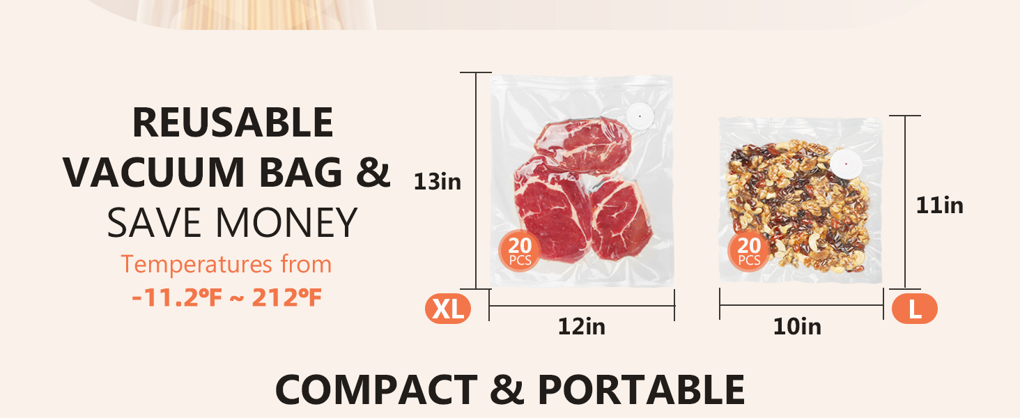 - 💰 WITH 40PCS L/XL SIZE VACCUM SEALER BAG - The reusable vacuum-sealable bags are made of BPA-free, food-grade materials. Stores food in temperatures ranging from -11.2℉to 212℉. Suitable for all foods including vegetables, fruits, mushrooms, meats, seafood, dry goods, leftovers and more. Reusable vacuum sealing bags can greatly reduce waste and save time, space and money.