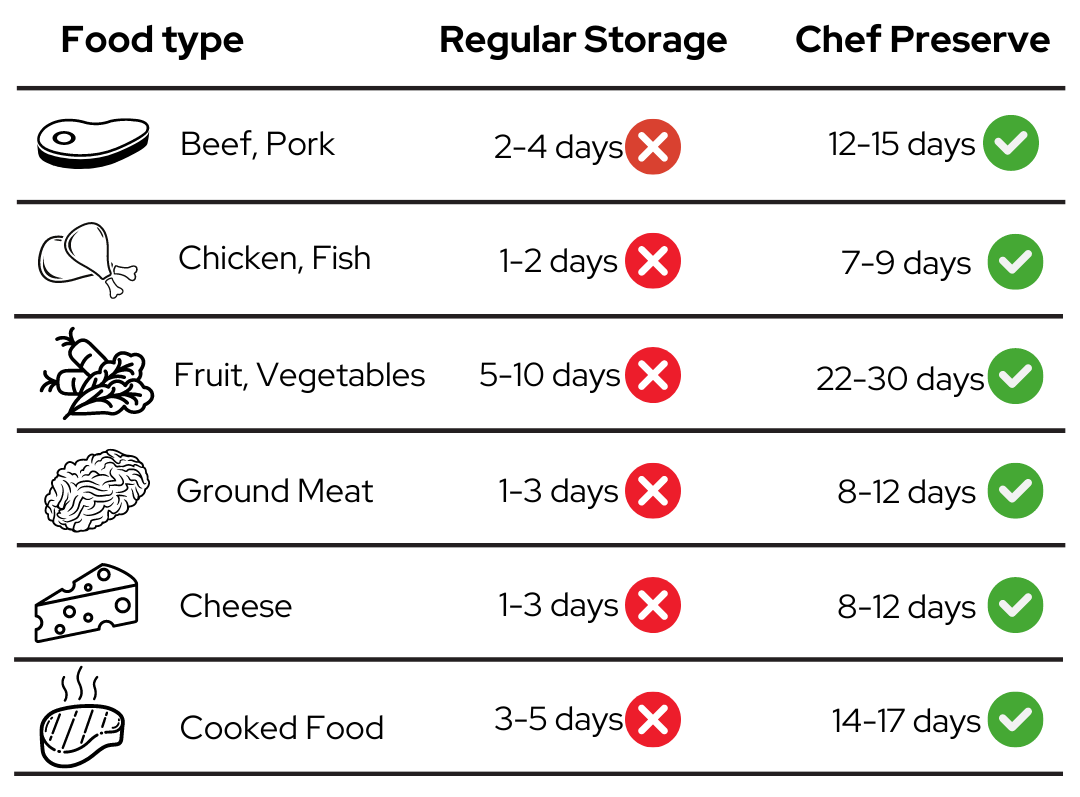 Chef Preserve will extend the shelf life of your food up to 5 times, whether stored in the fridge, freezer, or pantry.