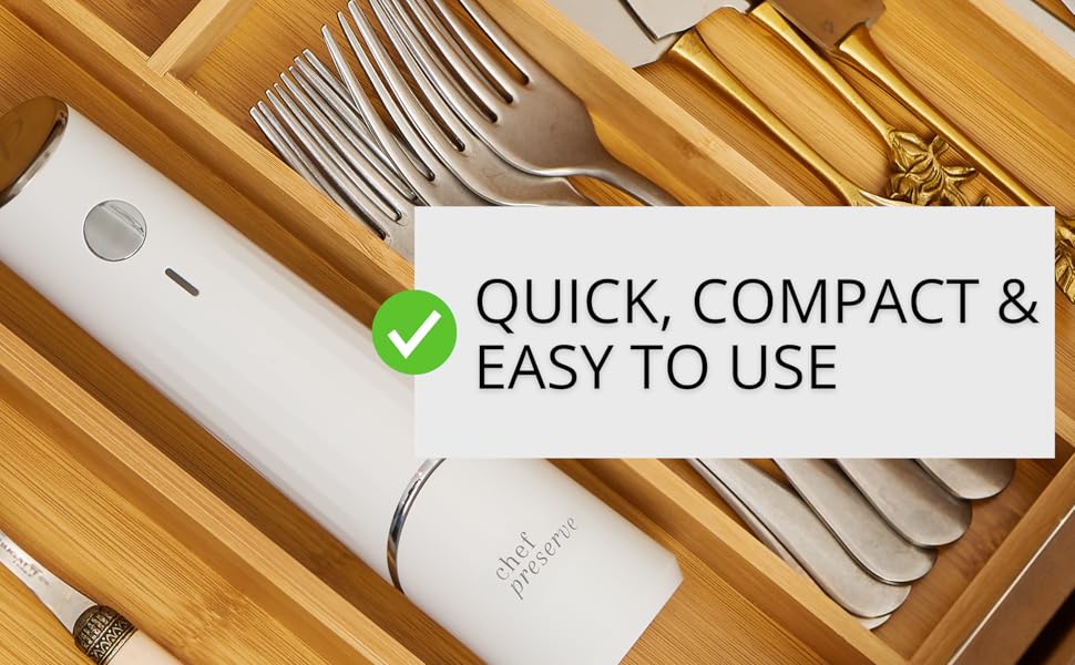 single-use plastic rolls and waste. Chef Preserve hand held vacuum sealer is the size of a pepper grinder, and super easy to use.