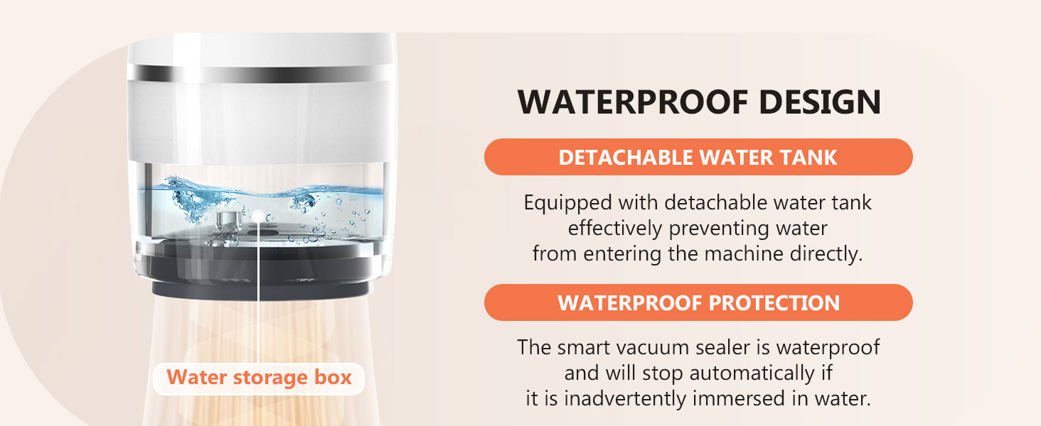 - 💦 WATERPROOF DESIGN -Vacuum Sealer Equipped with a visual removable water tank, when the water level crosses the maximum water level line, remove the tank to pour out the water and continue to use. The Vacuum Sealer is also equipped with intelligent protection measures, if the Vacuum Sealer enters water it will automatically stop to avoid mechanical failure. Recommended to use the vacuum machine several times when using food with liquid.
