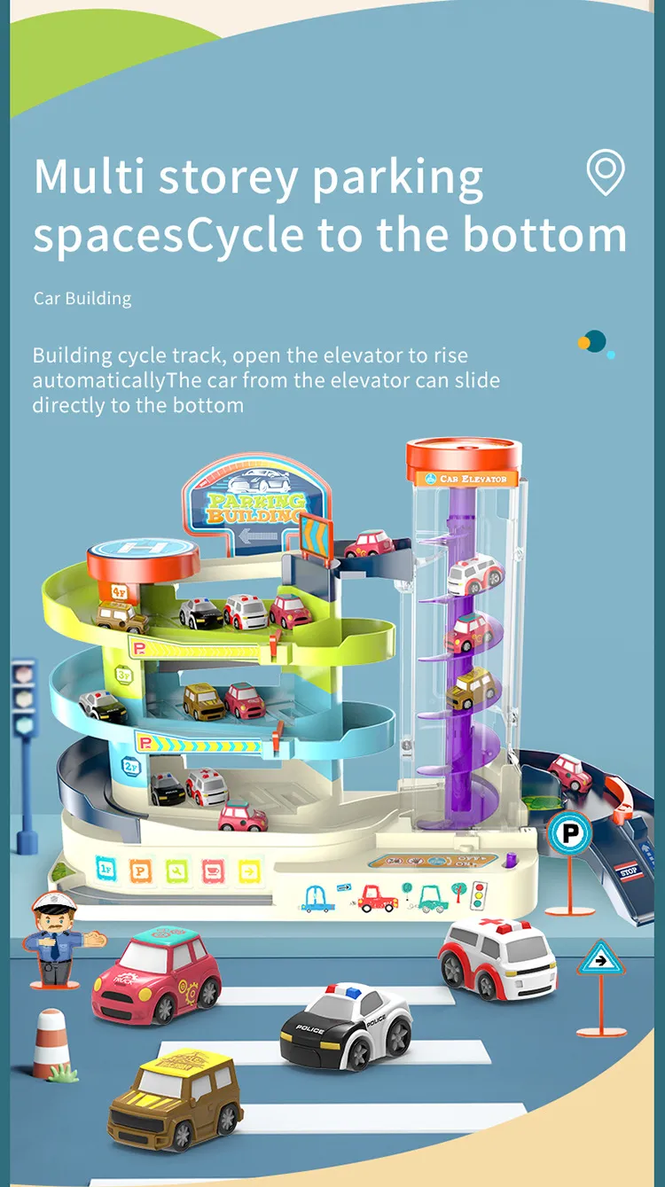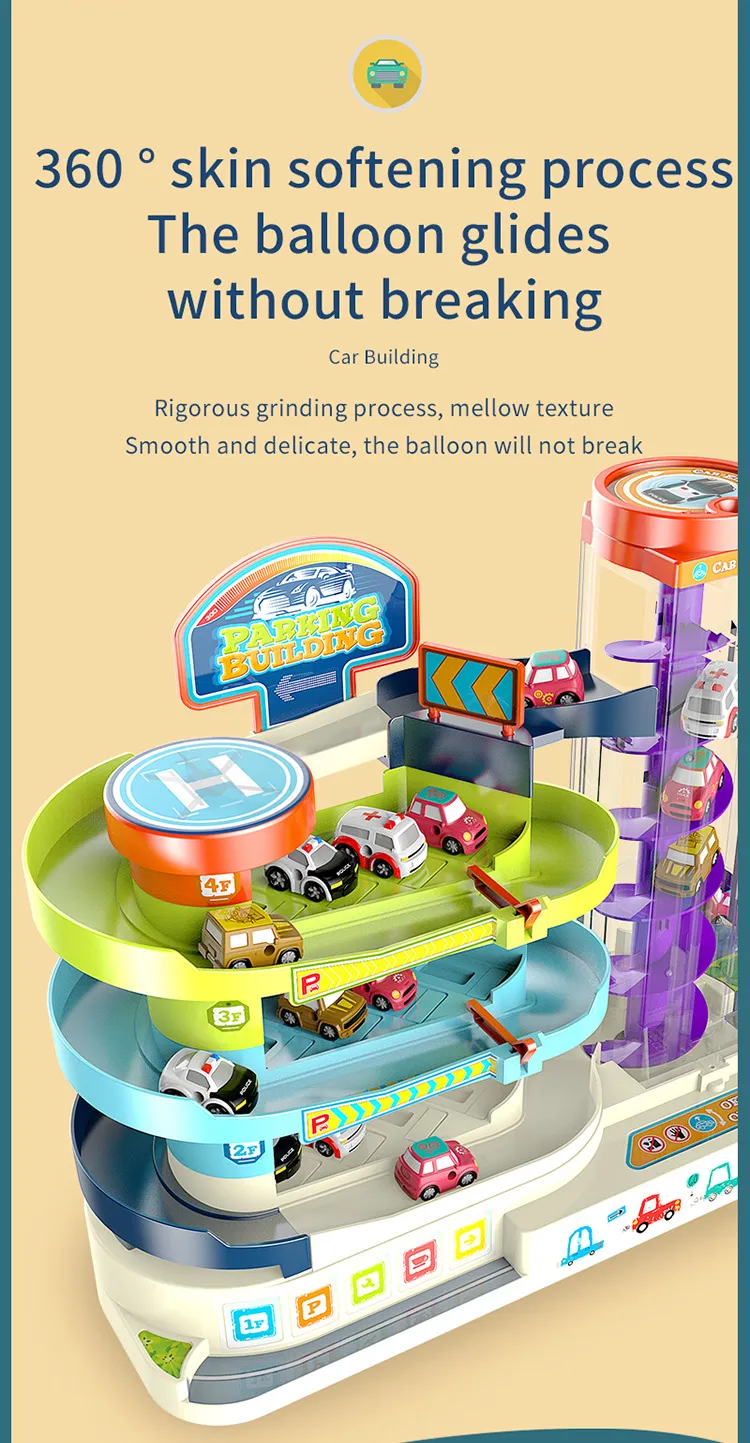 The set includes easy-to-assemble pieces, allowing children to construct their own parking lot and rail tracks. By fitting the various parts