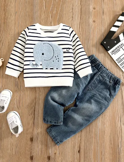 Children's Baby Suit Embroidered Striped Long-sleeved Jeans Suit – Stylish, Comfortable, and Trendy Outfit for Babies