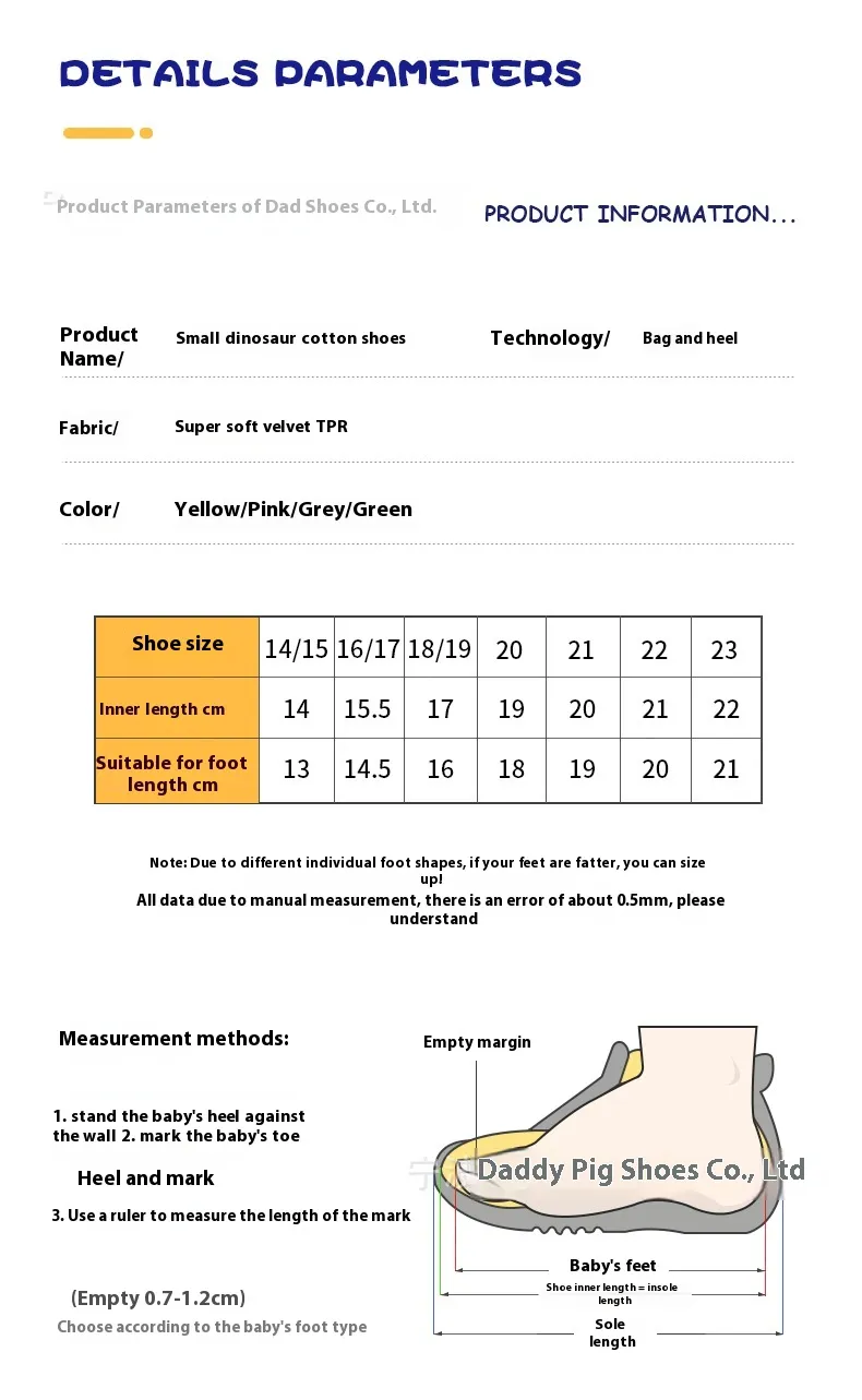 The Children's Bags Heel Cartoon Dinosaur Plush Cotton Shoes come with an easy-to-use velcro strap or elastic closure, ensuring that your child can put on and take off the shoes without any assistance. The adjustable fit provides a secure and snug closure, allowing for easy adjustment as your child’s feet grow. Whether they’re in a rush or taking their time, these shoes are incredibly user-friendly.