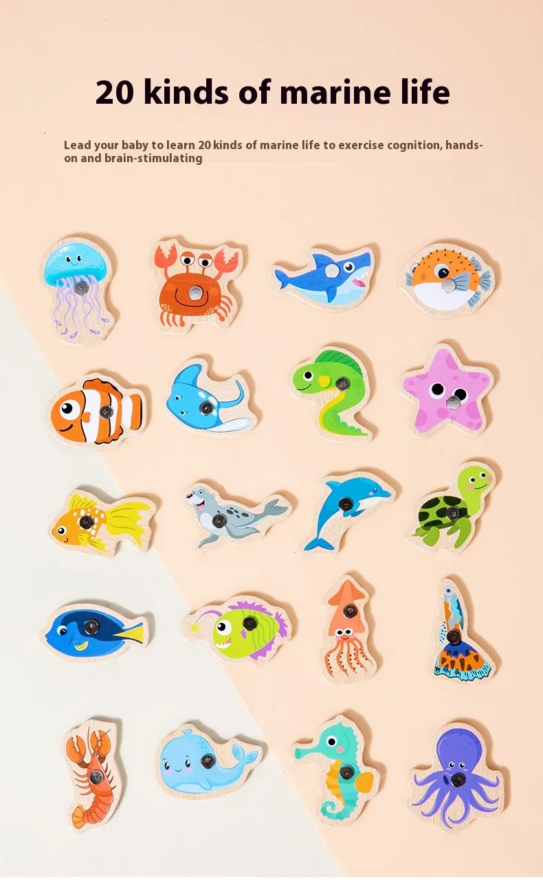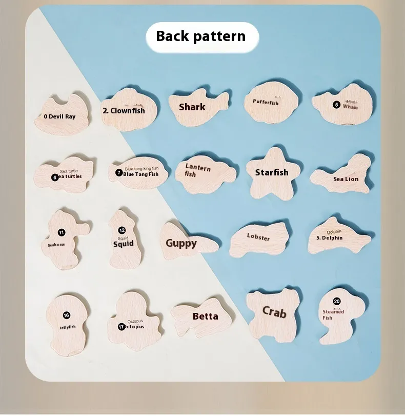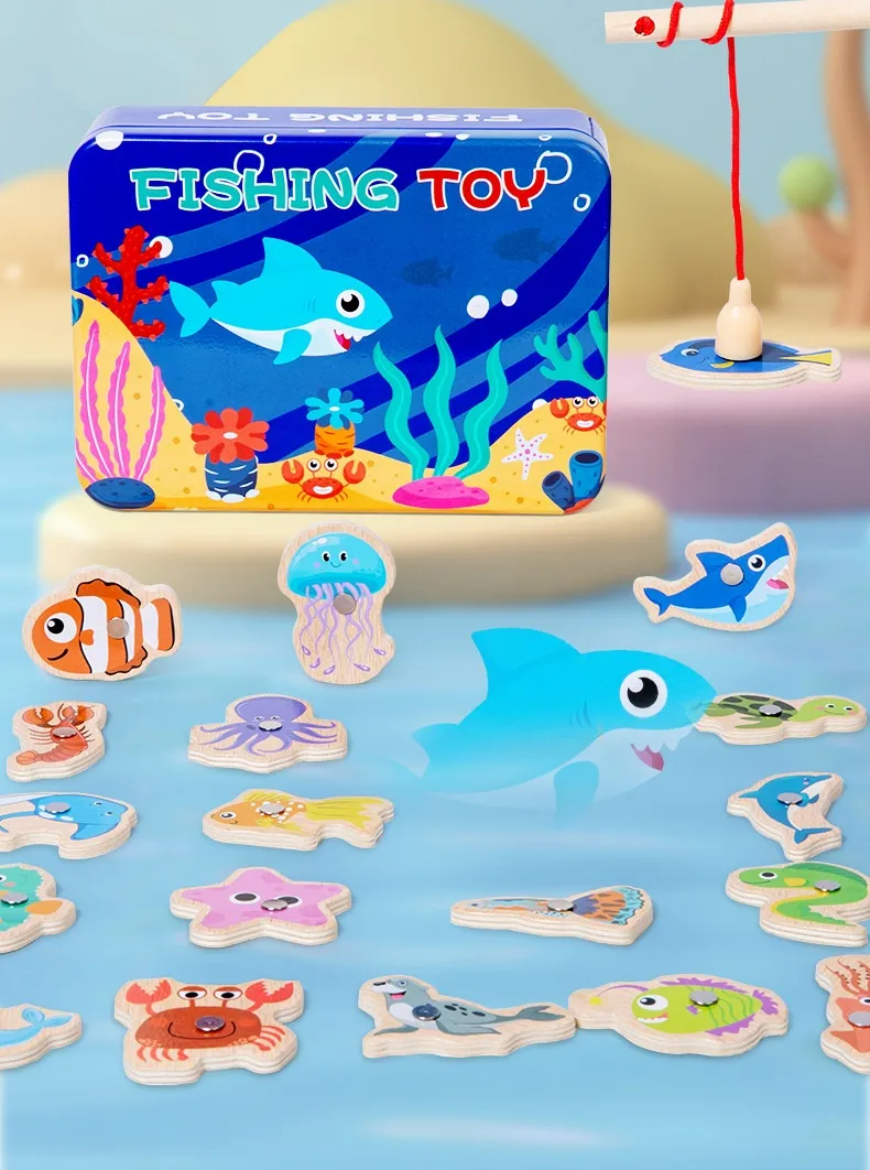 The highlight of the Children's Magnetic Fishing Toy Iron Box Wooden Baby Brain and Intelligence Suit is its magnetic fishing game. The set includes magnetic fish and rods, allowing children to "catch" the fish by using the rod's magnet to pick them up. This simple yet exciting game helps develop key skills like hand-eye coordination, fine motor skills, and concentration, as children focus on catching fish while learning the concept of magnetism.
