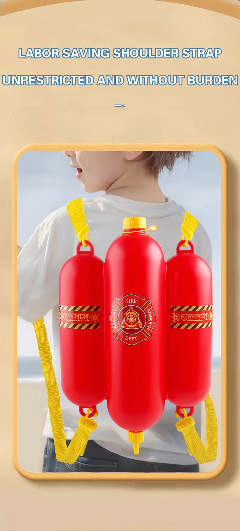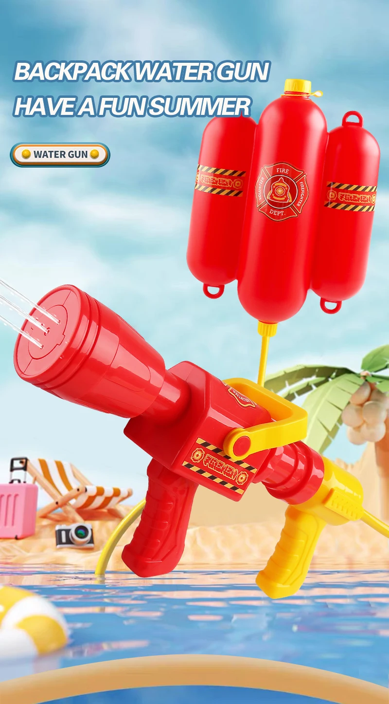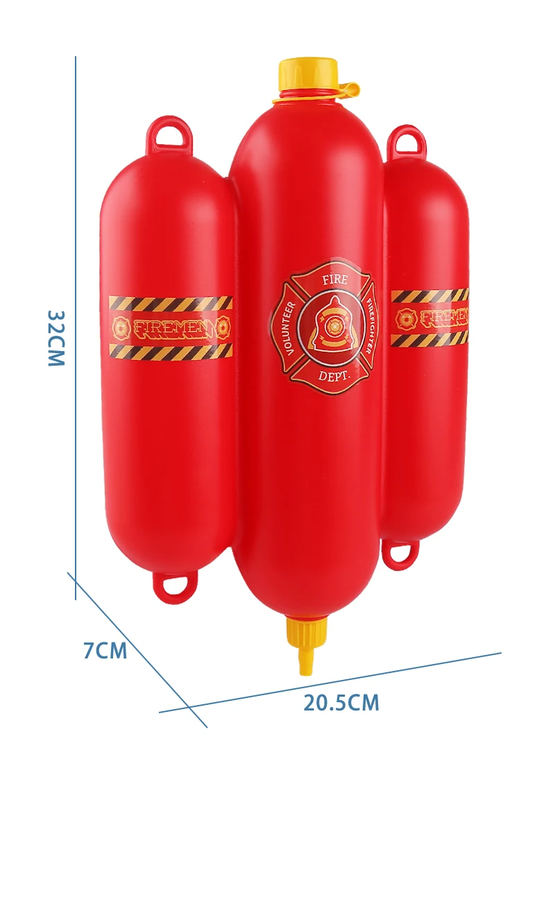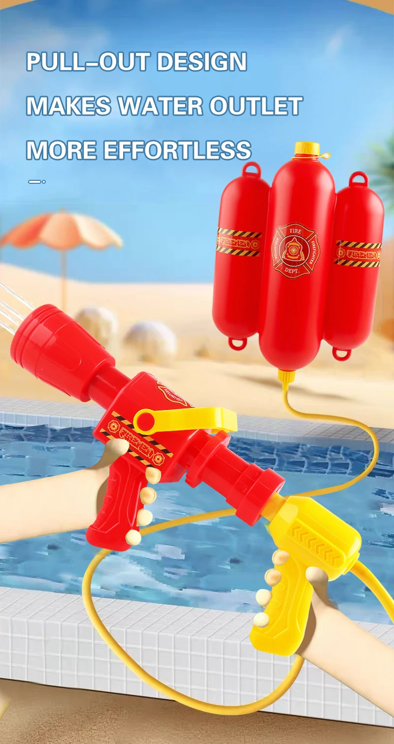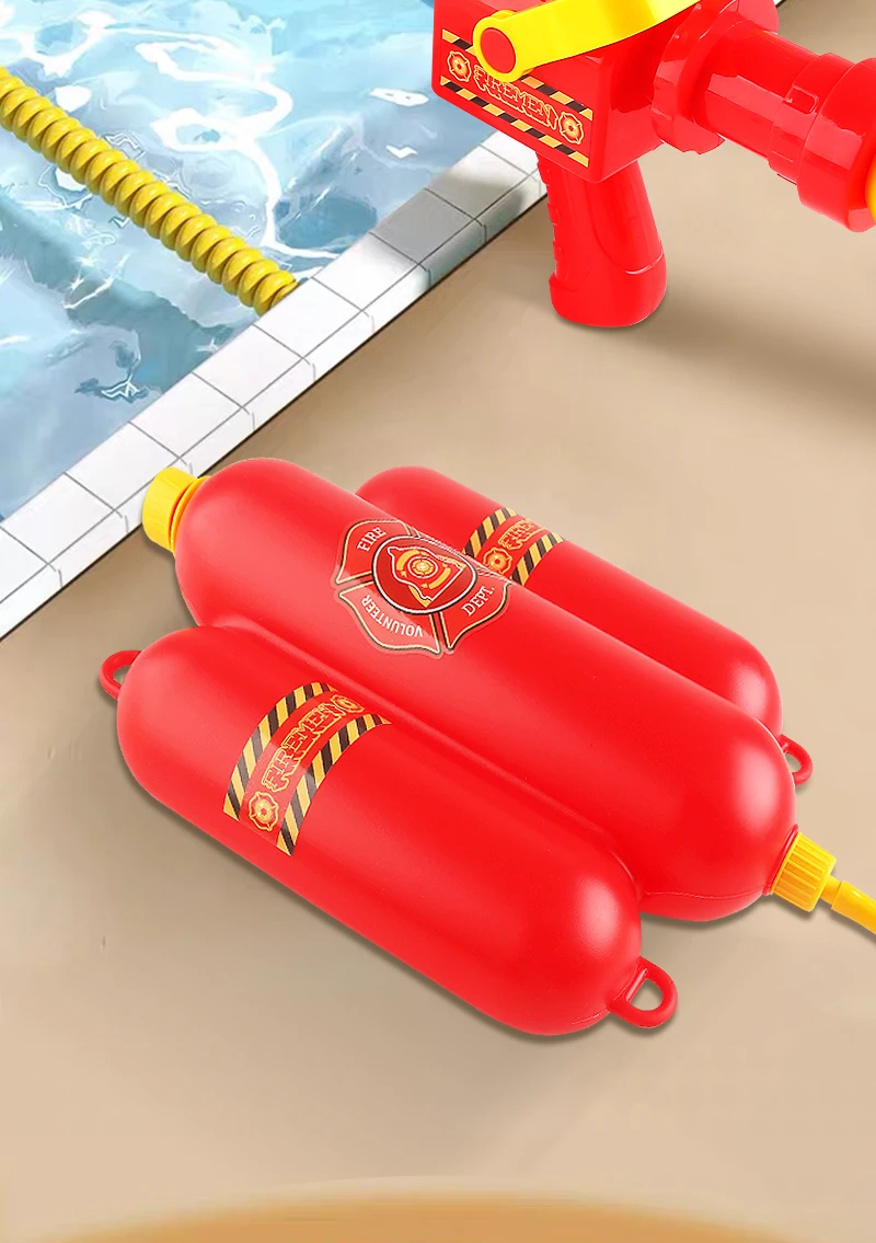water tank on their back for a hands-free water-fighting experience. This design mimics the appearance of a firefighter's equipment, giving