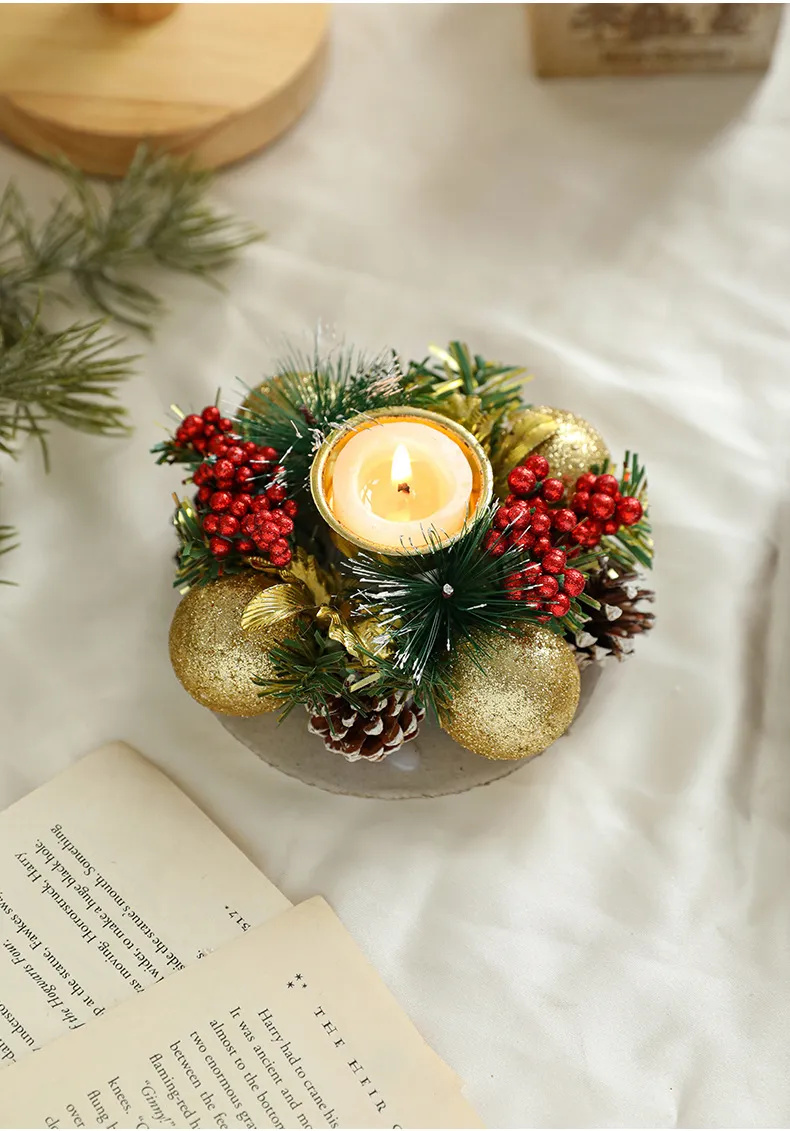Christmas Candle Metals Candlestick Wreath Artificial Pinball Pinecone Candle Holder Fake Leaves Xmas New Year Home Table Decor