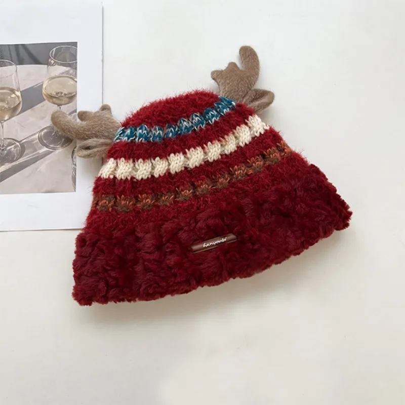 Christmas Knitted Hat With Cute Deer Antler Winter Warm Thick Hat For Girls Women