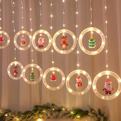 The Christmas LED Curtain Lights Set features multiple adorable festive icons including Santa Claus, reindeer, snowman, and Christmas tree designs. Made from durable plastic material and powered through USB, these lights are easy to use with any USB plug, power bank, laptop, or USB wall adapter. They are designed for indoor decorative use, perfect for holiday parties, window displays, and Christmas celebrations.