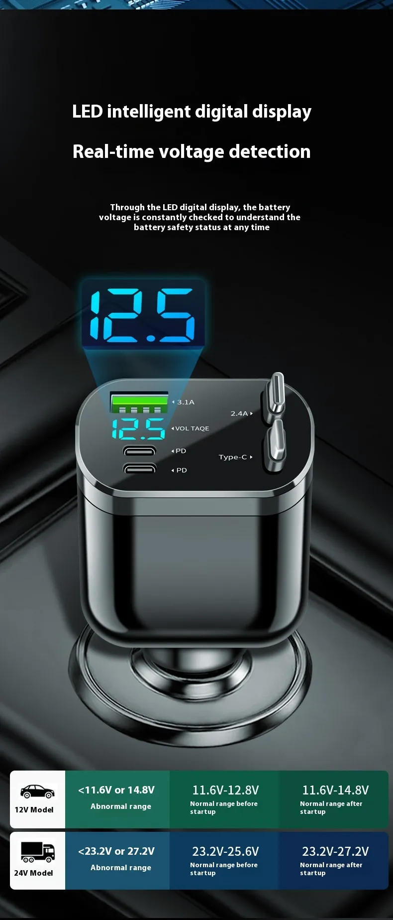 Input: 12V-24VDC, suitable for all vehicle models;