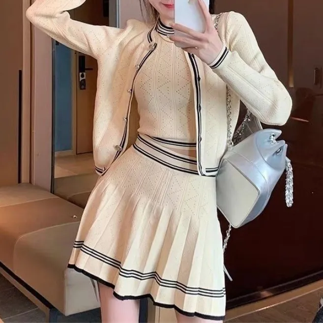 Classic Style Knitted Long Sleeve Cardigan Coat Inner Vest Women's Autumn Skirt Three-Piece Set: Elegant and Versatile for Fall