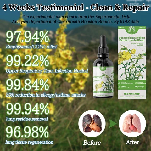 Breathe-Right Herbal Drops are absorbed sublingually. The ingredients act on the lungs and respiratory system through the blood, stimulate and thin the mucus in the trachea and lungs, help expel phlegm and lung residues within 2 hours, dredging the airway. It can also help correct your immune system, reduce allergic reactions through desensitization therapy, and effectively treat diseases such as respiratory allergies/asthma. The fifth-generation human modified protein repair factor created by our research team, combined with the extracts of mullein and Dendrobium officinale, helps the regeneration of lung trachea and alveolar tissue, giving you a healthy and unobstructed lung.