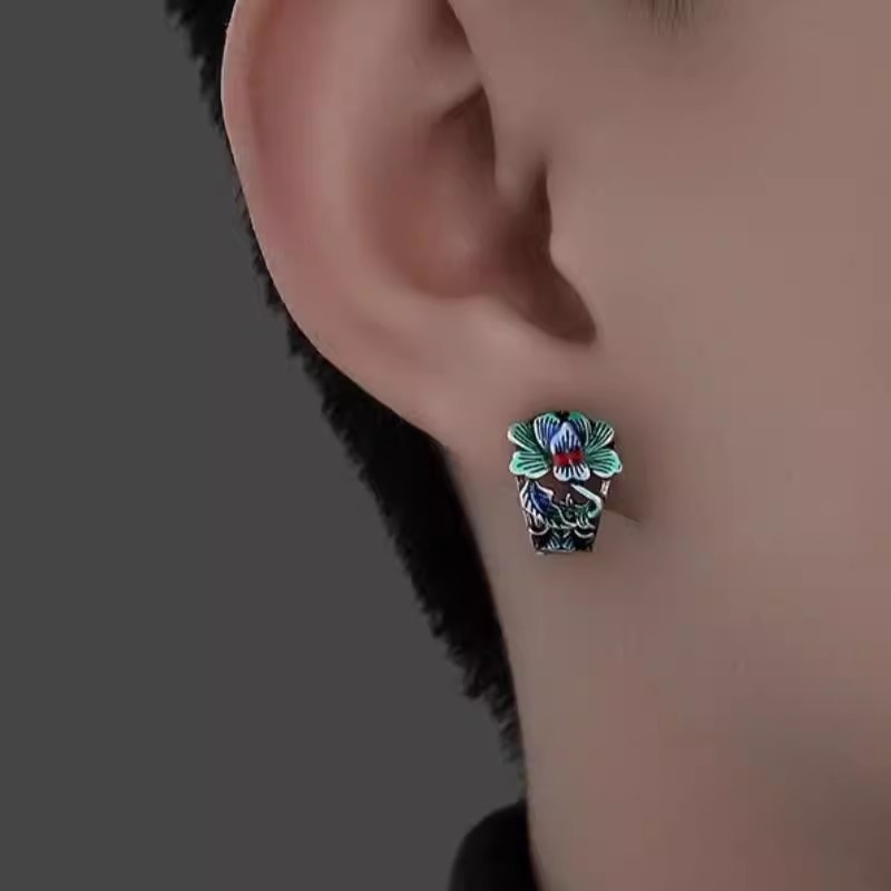 Cloisonne Peony Flower Men's Earrings Fashion Nation