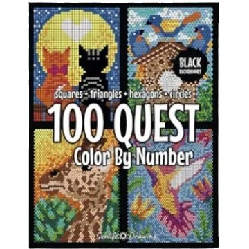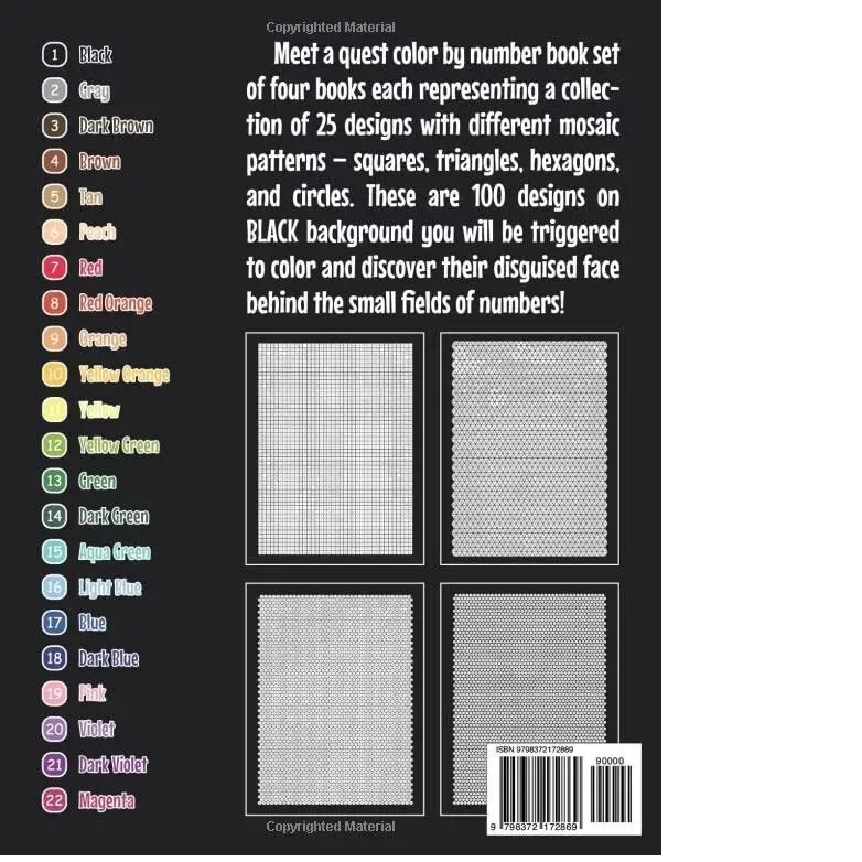 Meet a quest color by number book set of four books each representing a collection of 25 designs with different mosaic patterns – squares, triangles, hexagons, and circles. These are 100 designs on BLACK background you will be triggered to color and discover their disguised face behind the small fields of numbers!