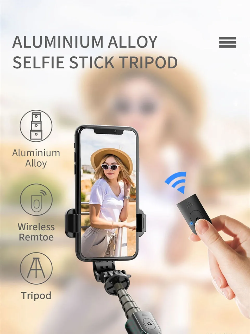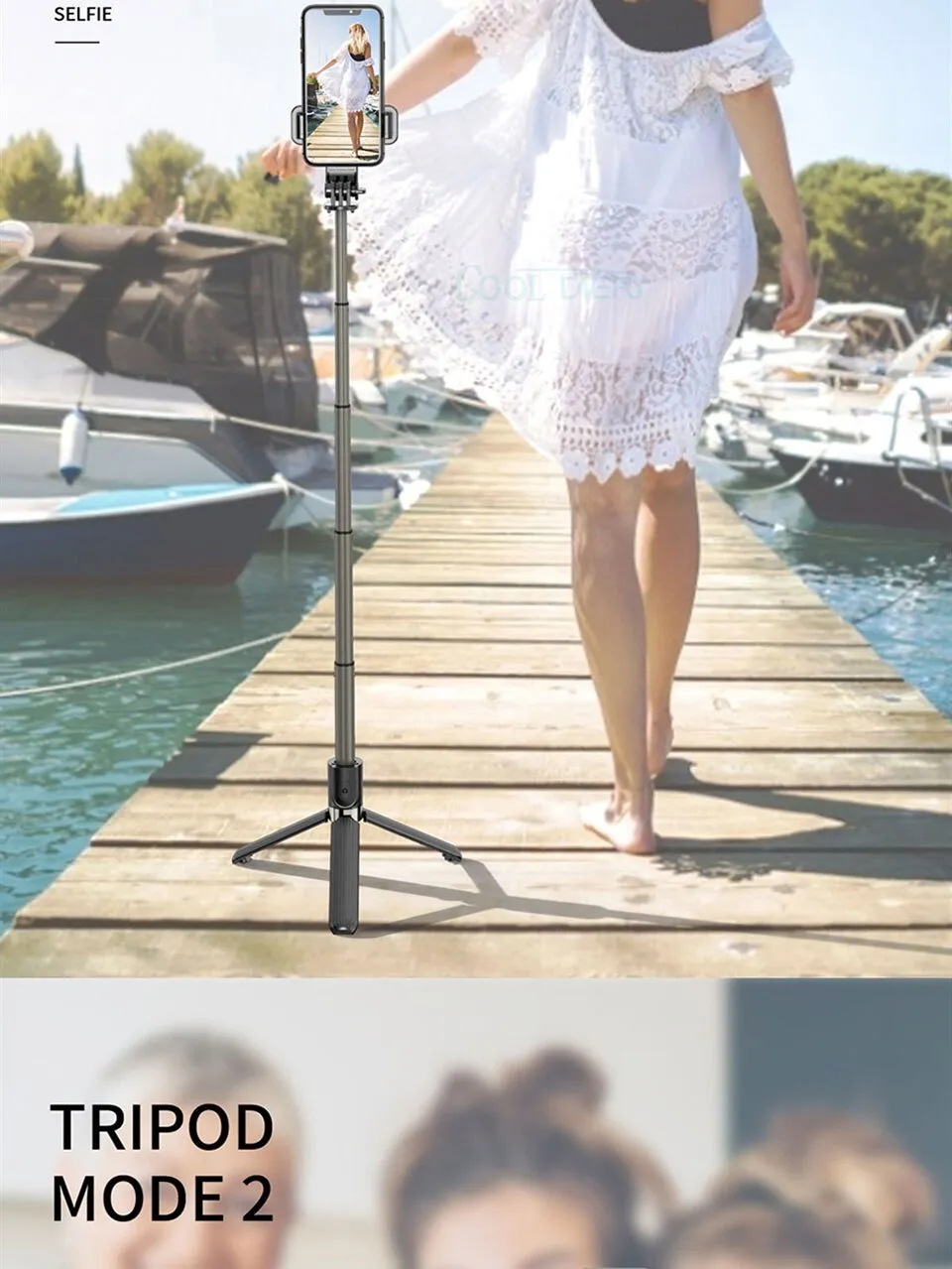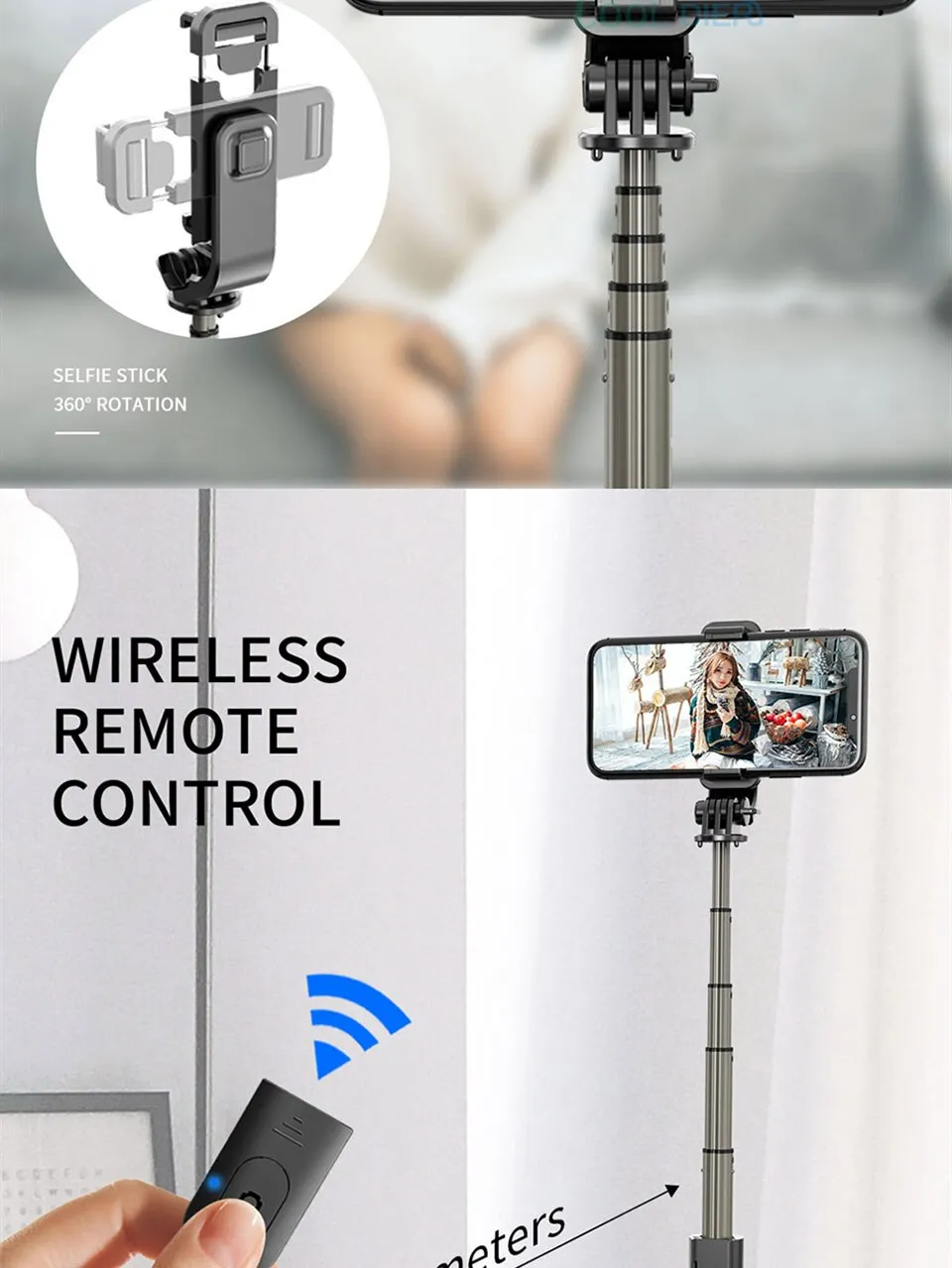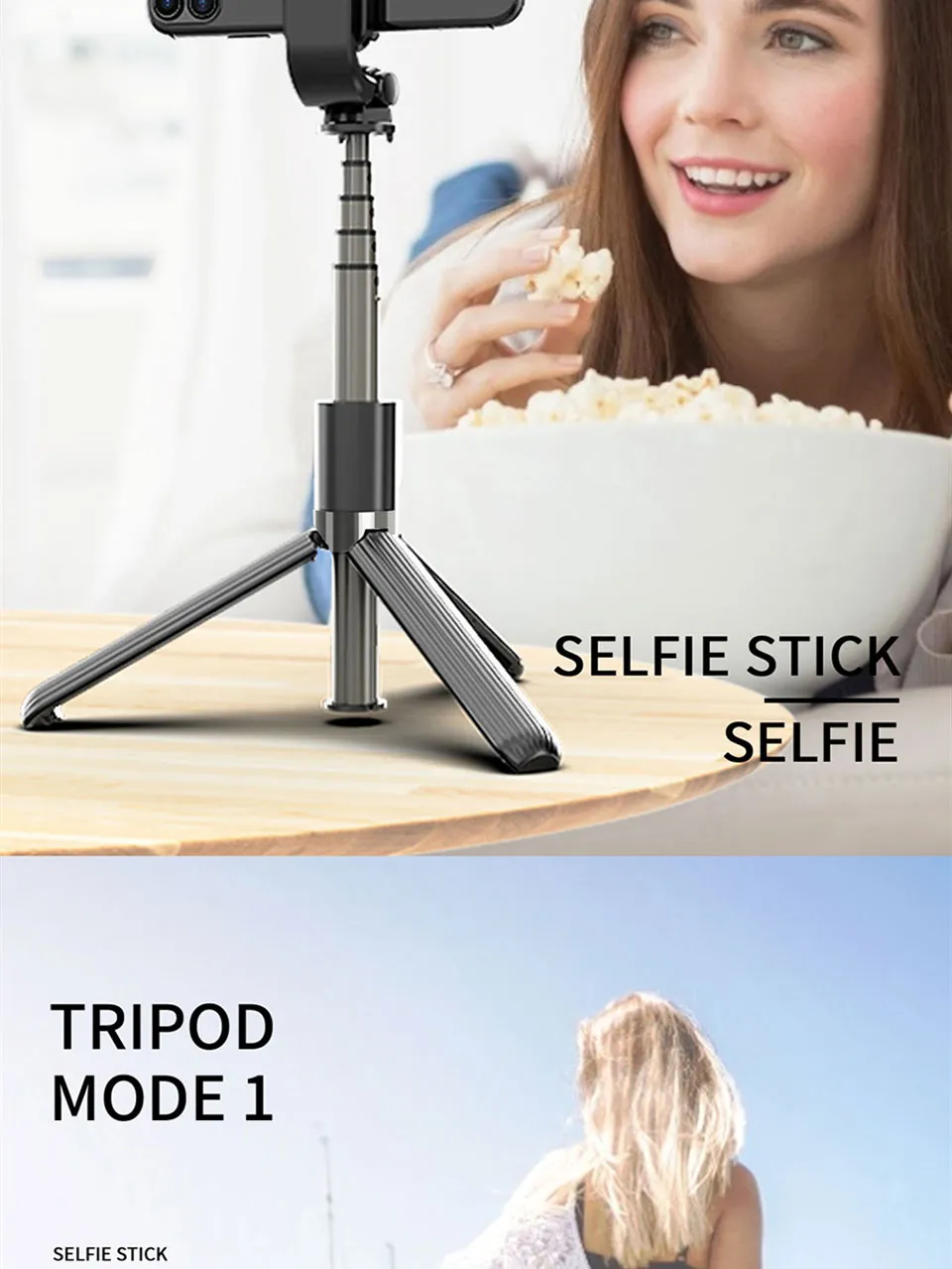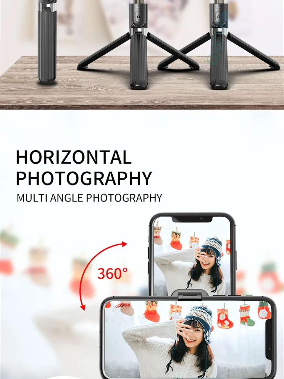 - Extendable selfie stick for adjustable height and angles
