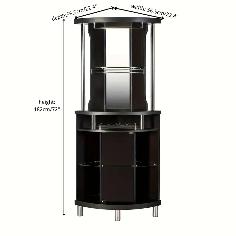 The Corner Wine Cabinet is expertly crafted with durable engineered wood, offering both strength and longevity. The chrome-finished metal legs give it a sleek, modern aesthetic that complements the elegant glass mirror accents, creating a stunning focal point in any room. Its floor-mounted design ensures stability and a polished look, while the large storage capacity provides ample space to display your collection of wines, glassware, and bar tools.
