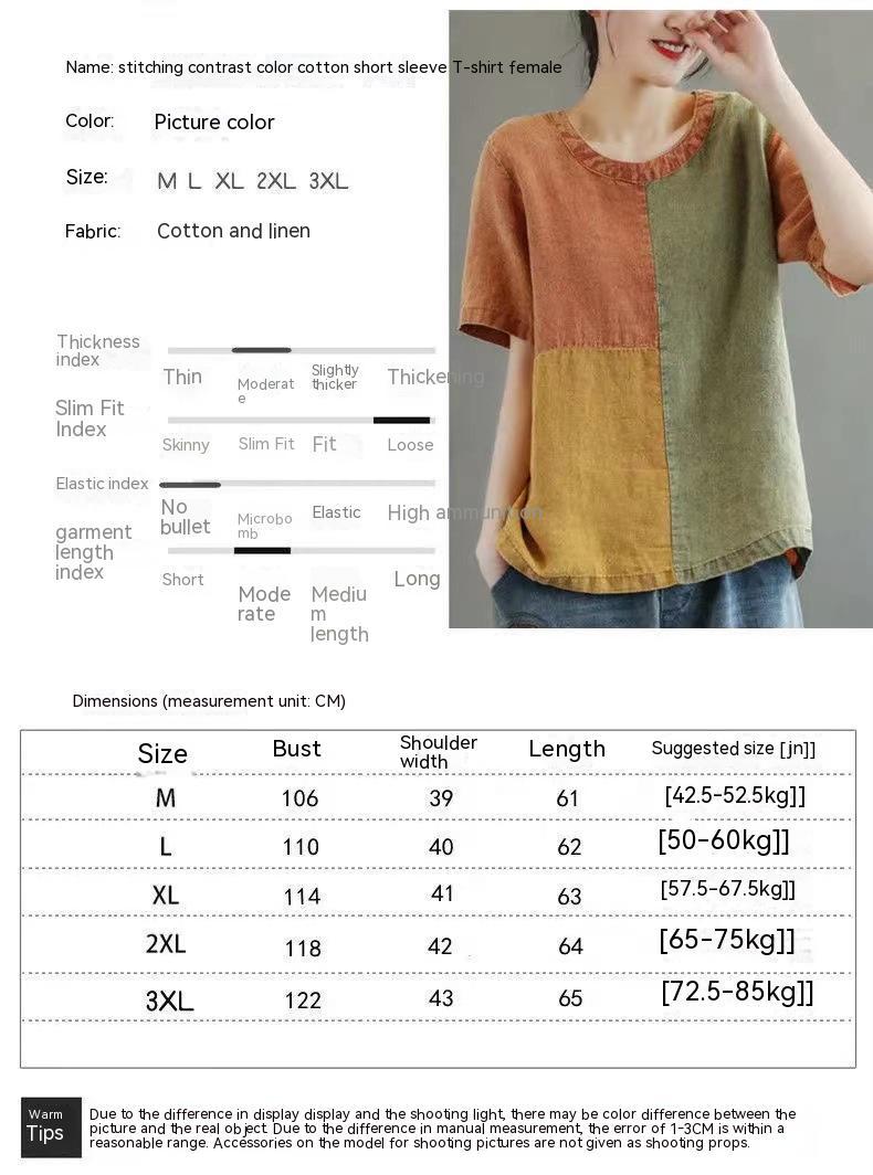 Cotton Linen Contrast Color T-shirt Artistic Design