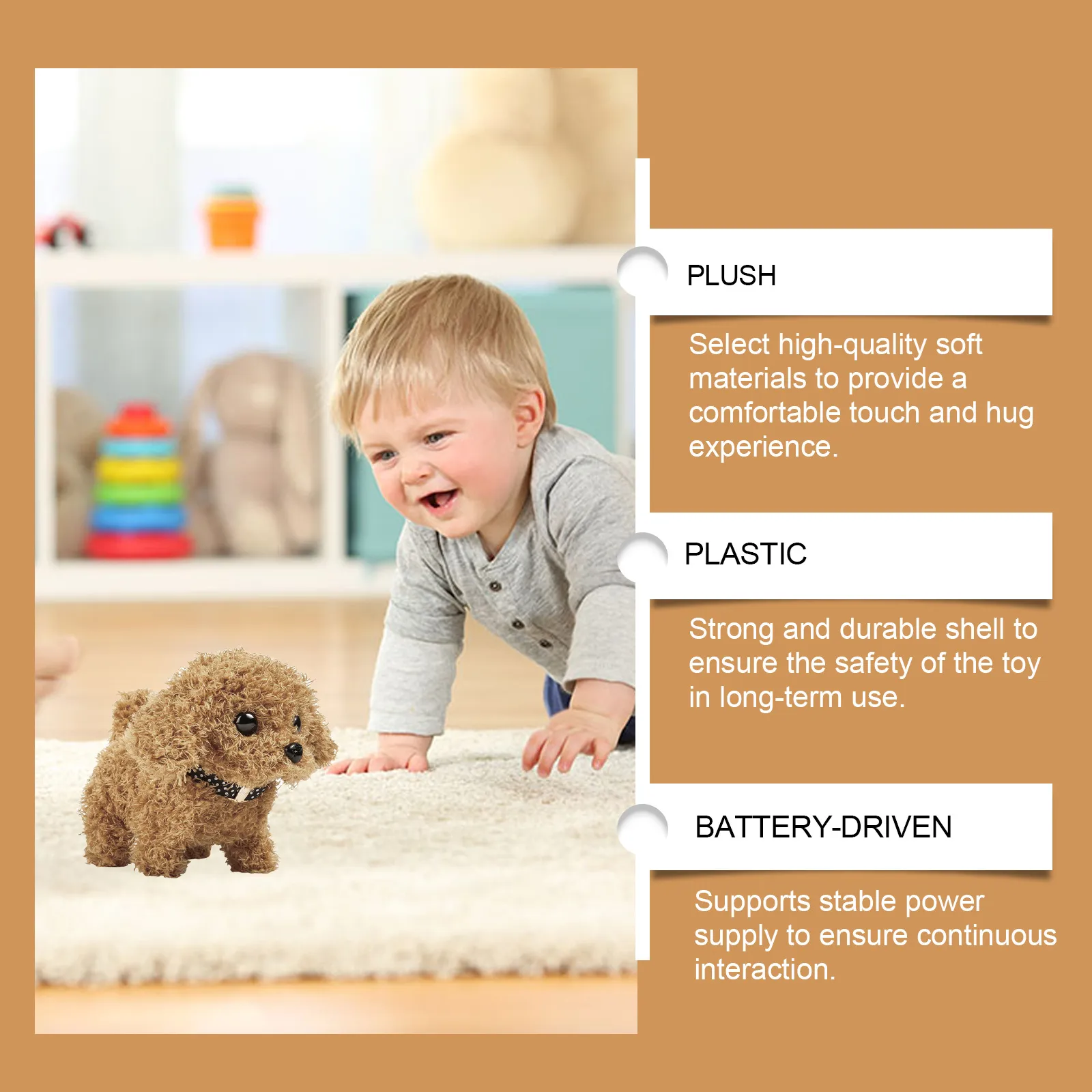 Made from premium, ultra-soft plush fabric, this toy dog offers the perfect amount of cuddly comfort. It’s filled with a plush stuffing that gives it a squishy, huggable feel, making it ideal for snuggling. The soft texture ensures that children can play with it all day without discomfort, and it is equally suitable for adults who love a soft, comforting toy companion.