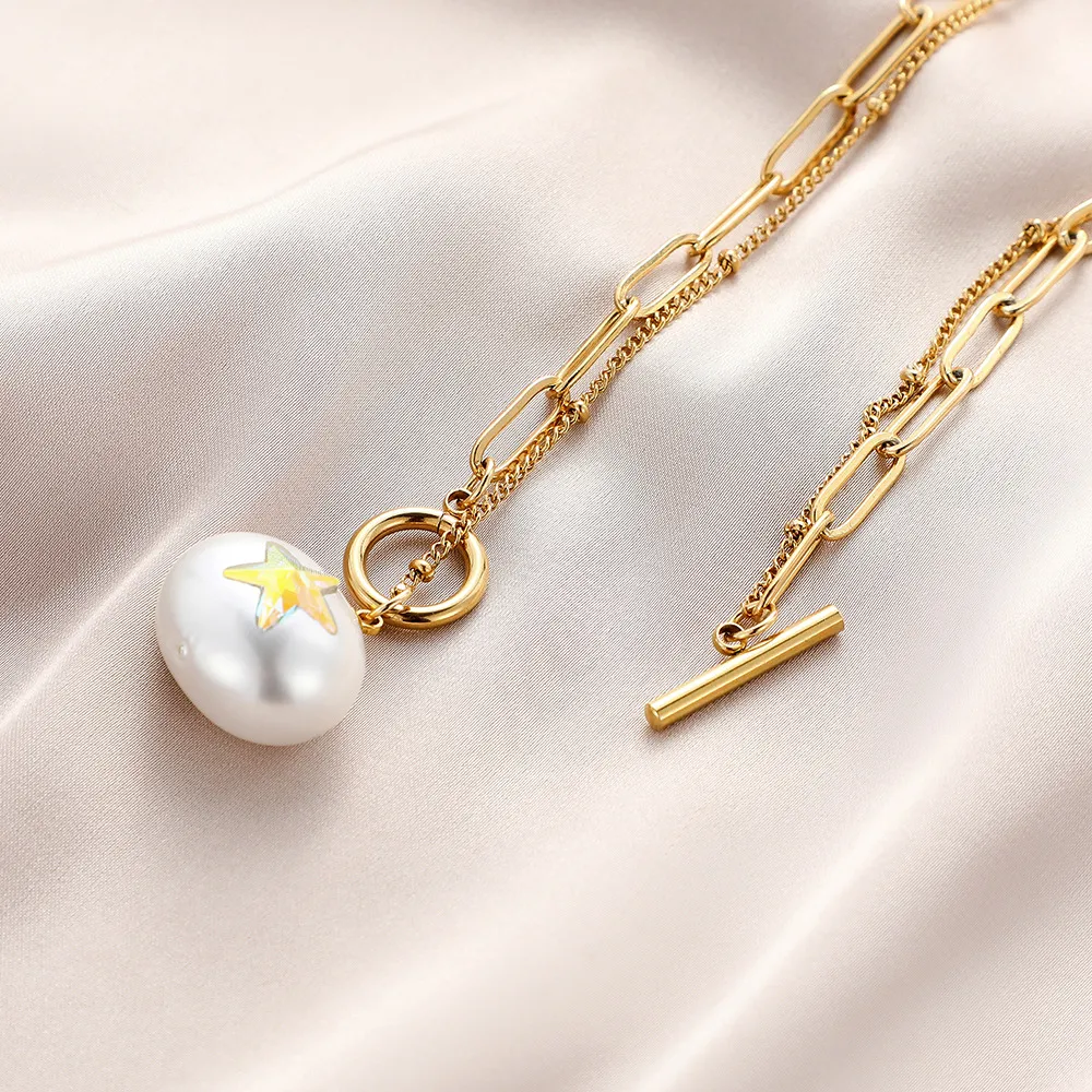 With a design that nods to European and American fashion trends, this necklace makes a statement while offering versatility for everyday wear. The high-shine stainless steel ensures long-lasting durability, while the round pearl offers a natural, elegant touch. The star pendant adds an eye-catching feature, giving this piece an otherworldly, celestial feel. Perfect for women who appreciate fine craftsmanship and eye-catching design, this necklace is sure to become a treasured addition to any jewelry collection.