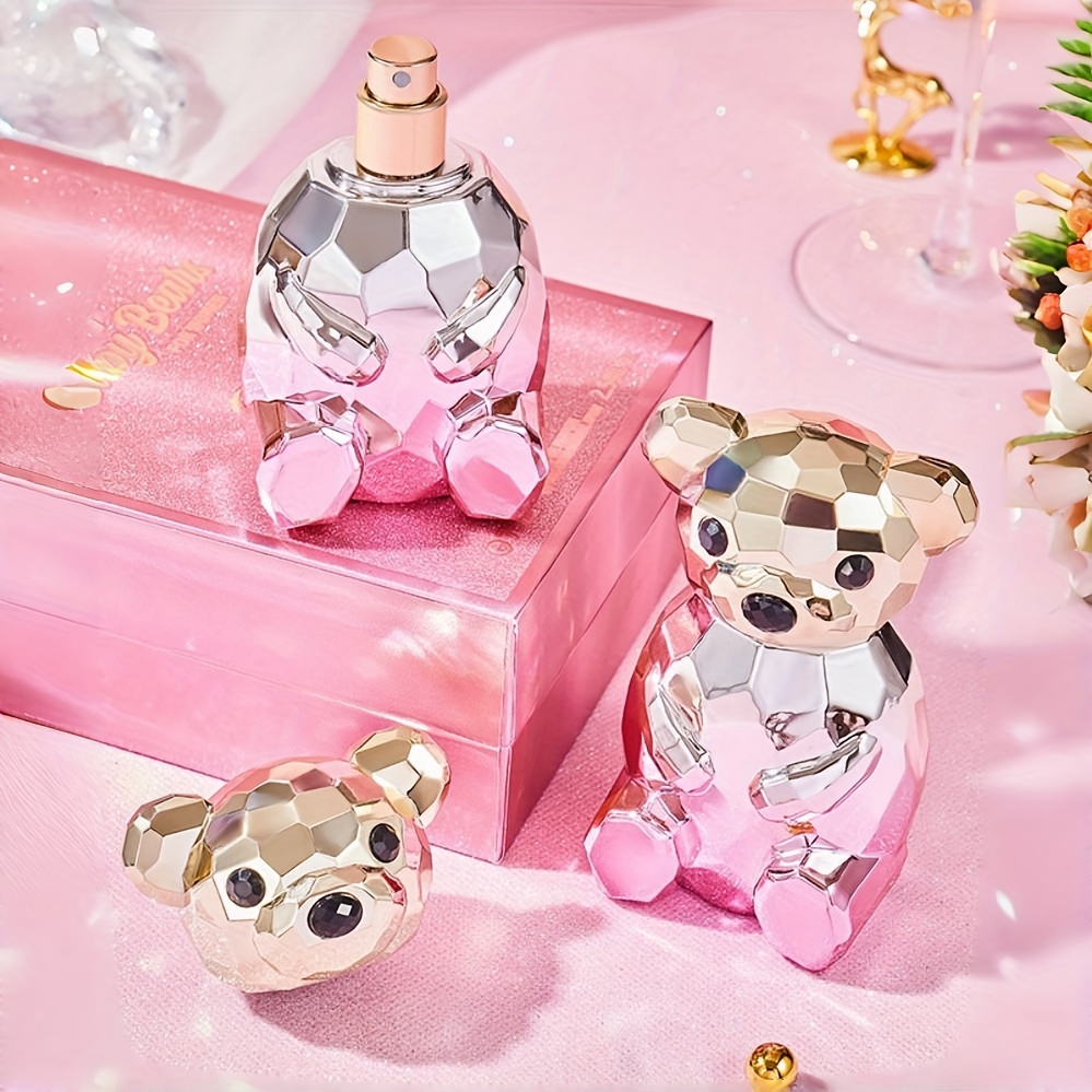 The faceted crystal bear design adds a luxurious and playful touch, making it a standout piece on any vanity or shelf.