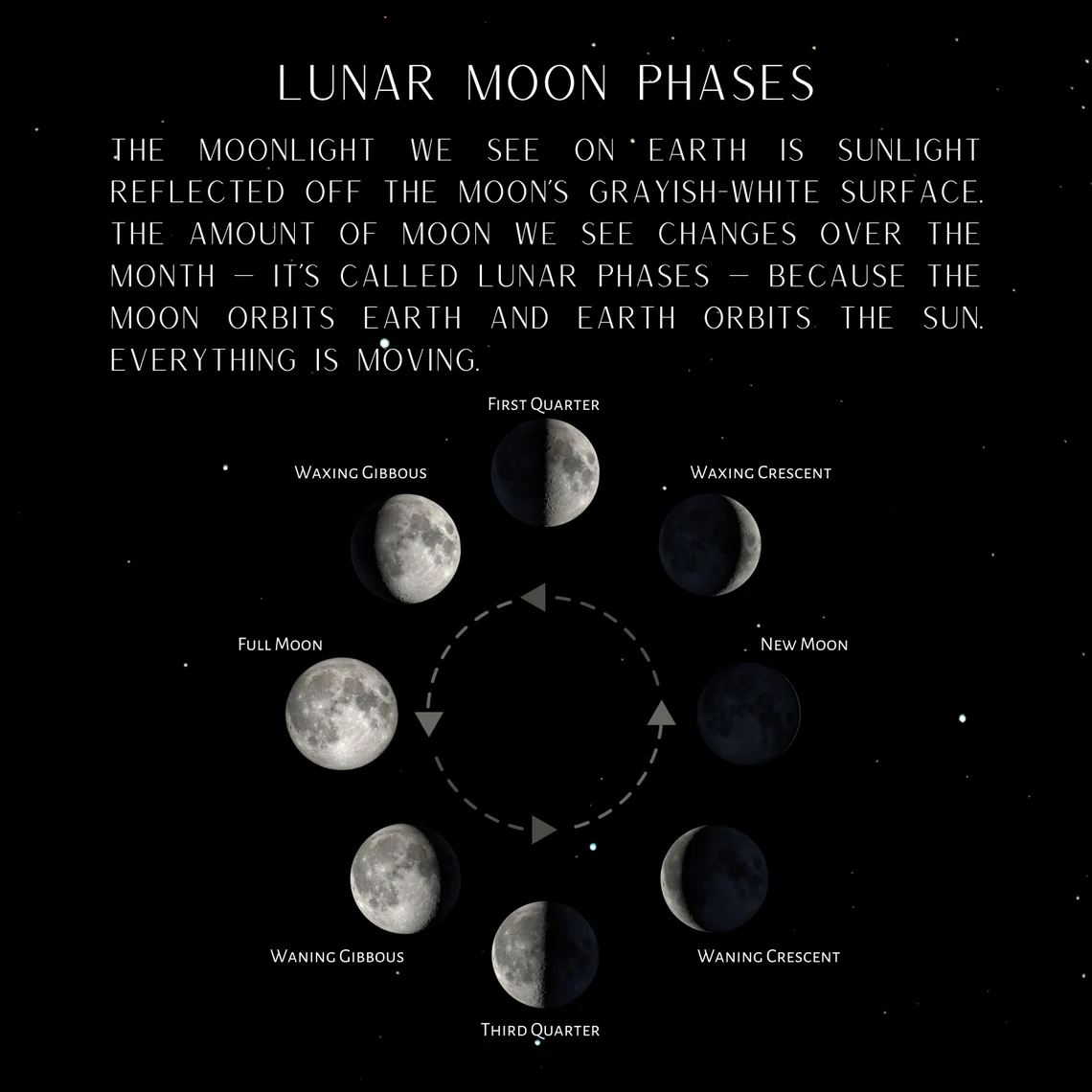 As the moon, Earth, and the sun go through their orbital dance, the part of the moon that's illuminated by sunlight moves in and out of our view, creating a predictable series of lunar phases. In any given month we see eight distinct phases of the moon, defined by how much of the lunar disk is illuminated from our perspective and whether the moon is heading toward or away from being full.