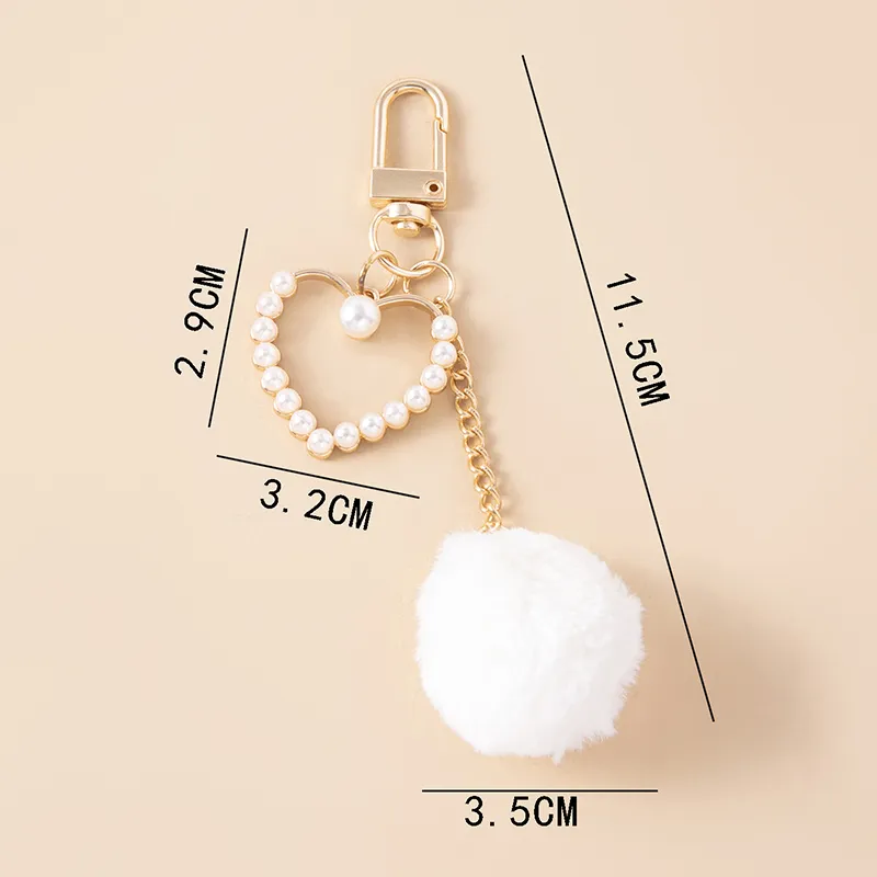 Cute White Plush Ball Keychain Fashion Pompoms Pearls Heart Charms Key Chain