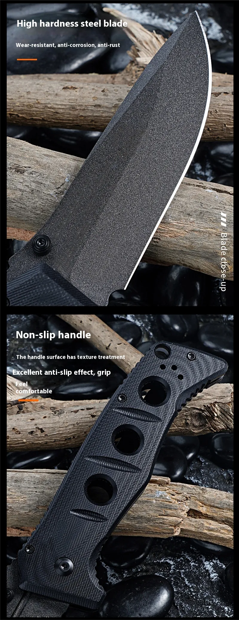 - Ergonomic G10 Handle: The G10 handle is lightweight, durable, and resistant to moisture, providing a firm and comfortable grip. Its textured surface ensures maximum control, even in wet or slippery conditions, making it ideal for outdoor activities.