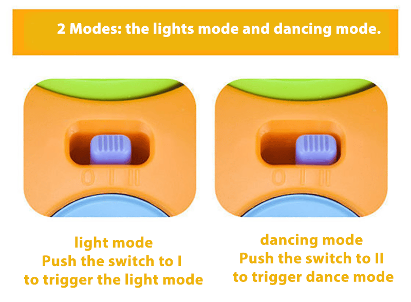- 2 Modes: The toy features 2 modes, including the lights mode and dancing mode. Push the switch to the 1st position, and the colored lights flash, push the switch to the 2nd position, the toy wiggles and dances with the lights and sounds.