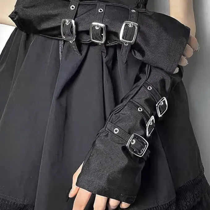 Embrace your edgy side with the Dark Metal Button Cuffs Gothic Half Open Finger Wristband Gloves. Featuring an innovative design with dark metal button cuffs and a unique half-open finger style, these gloves offer a perfect blend of punk, Y2K, and gothic aesthetics. Whether you're looking for a statement accessory for a Halloween costume, a protective arm warmer for outdoor activities, or a stylish addition to your streetwear collection, these gloves are a versatile piece for both function and fashion. With their sun protection sleeve design and unique strap detailing, they’re ideal for adding a bold touch to any outfit.