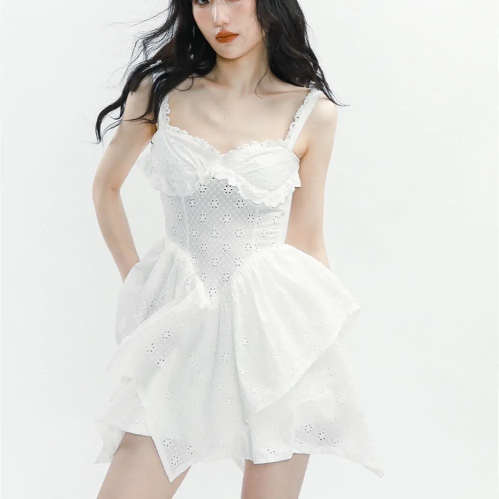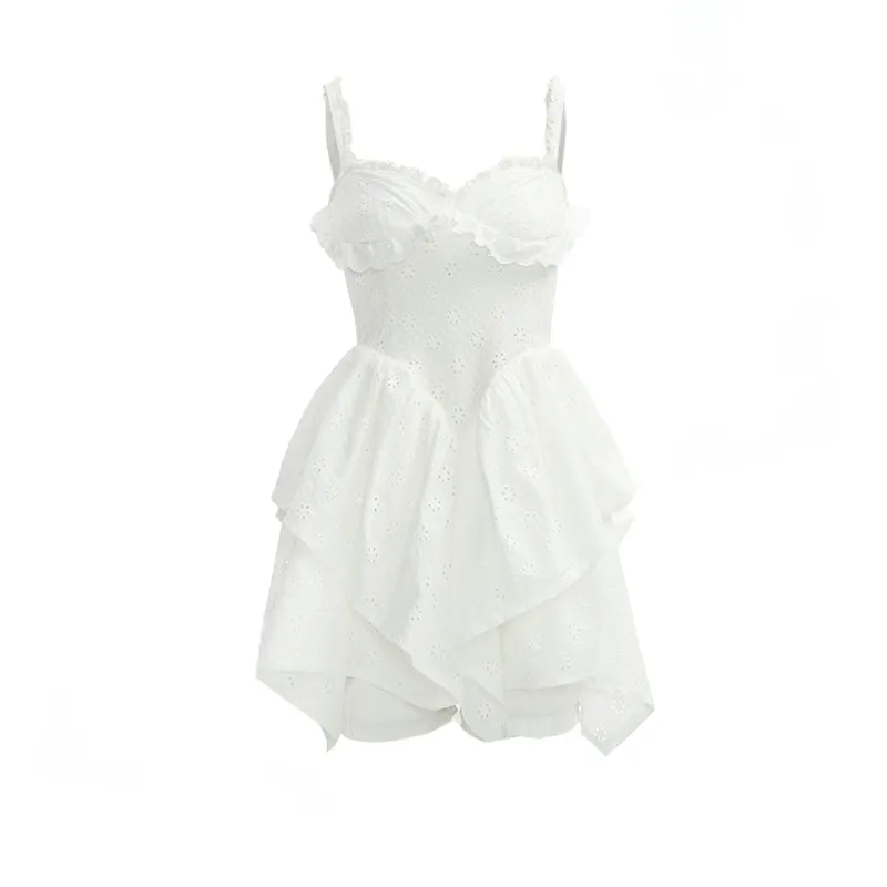 The openwork embroidery flowers on the bodice and skirt of the dress add a subtle, textured elegance that makes this piece stand out. The design is both sophisticated and playful, capturing the essence of spring and summer with its light and airy feel. Whether you pair it with heels for a night out or with sandals for a more laid-back look, the Design First Love Dress will effortlessly enhance your personal style.