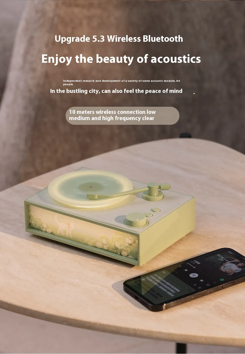 environment. This innovative speaker features a vintage-inspired vinyl design, bringing a touch of nostalgia to your desk while delivering