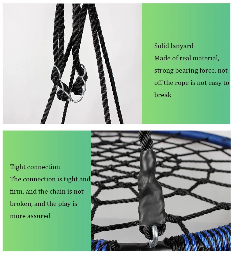 Made with strong and durable materials like high-quality rope and a sturdy frame, the round nest swing is built to last. The thick rope ensures safety and stability while swinging or climbing, making it ideal for both kids and adults. The materials are weather-resistant, ensuring the swing’s durability even when exposed to outdoor elements.