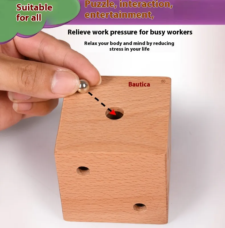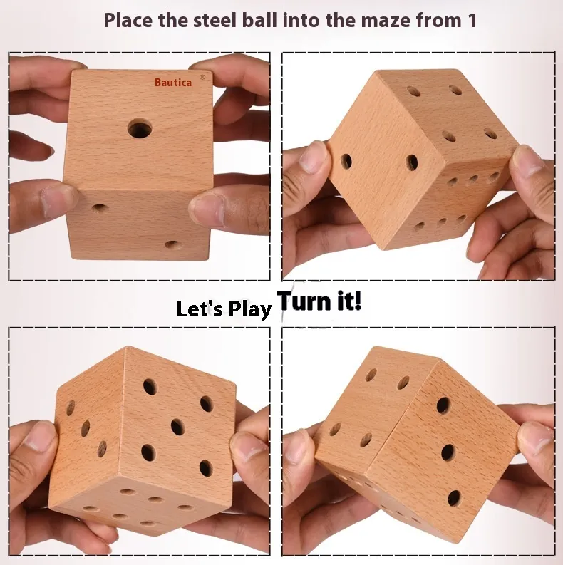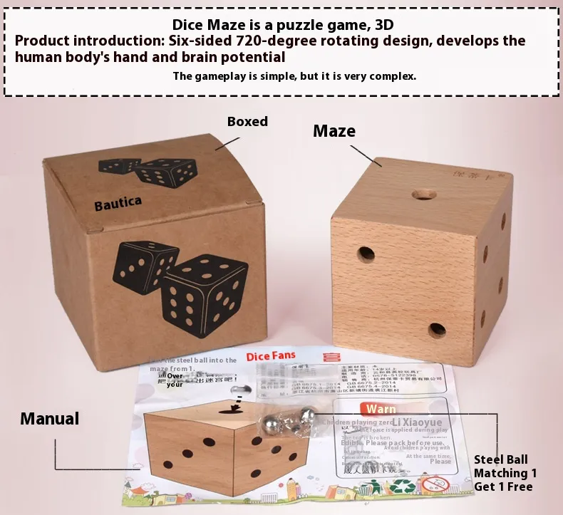 The heart of the toy lies in its 3D dice-shaped design, each face featuring a different maze or path for the small steel ball inside to navigate. Children must tilt, rotate, and manipulate the dice to guide the ball through various channels, promoting concentration, problem-solving, and patience.