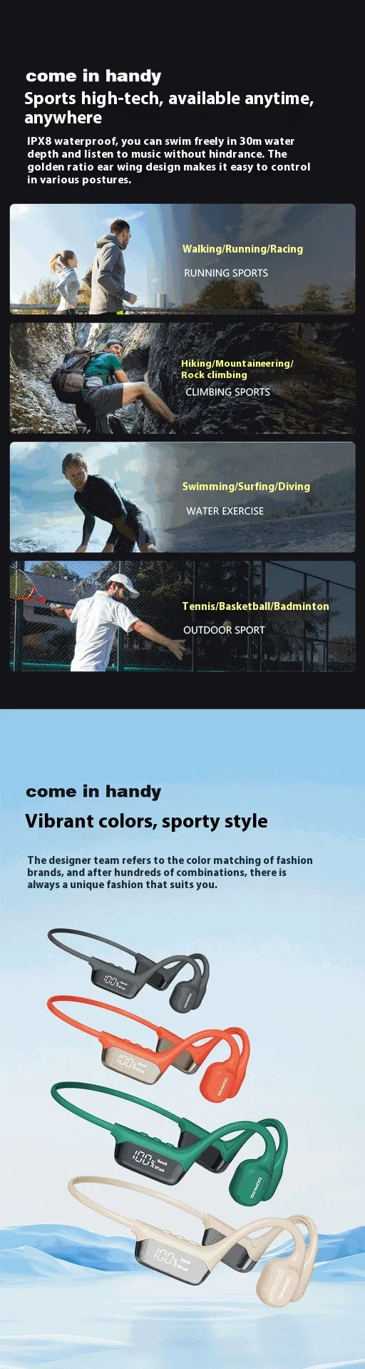 Function: waterproof, bone conduction, call function, support music, digital display screen