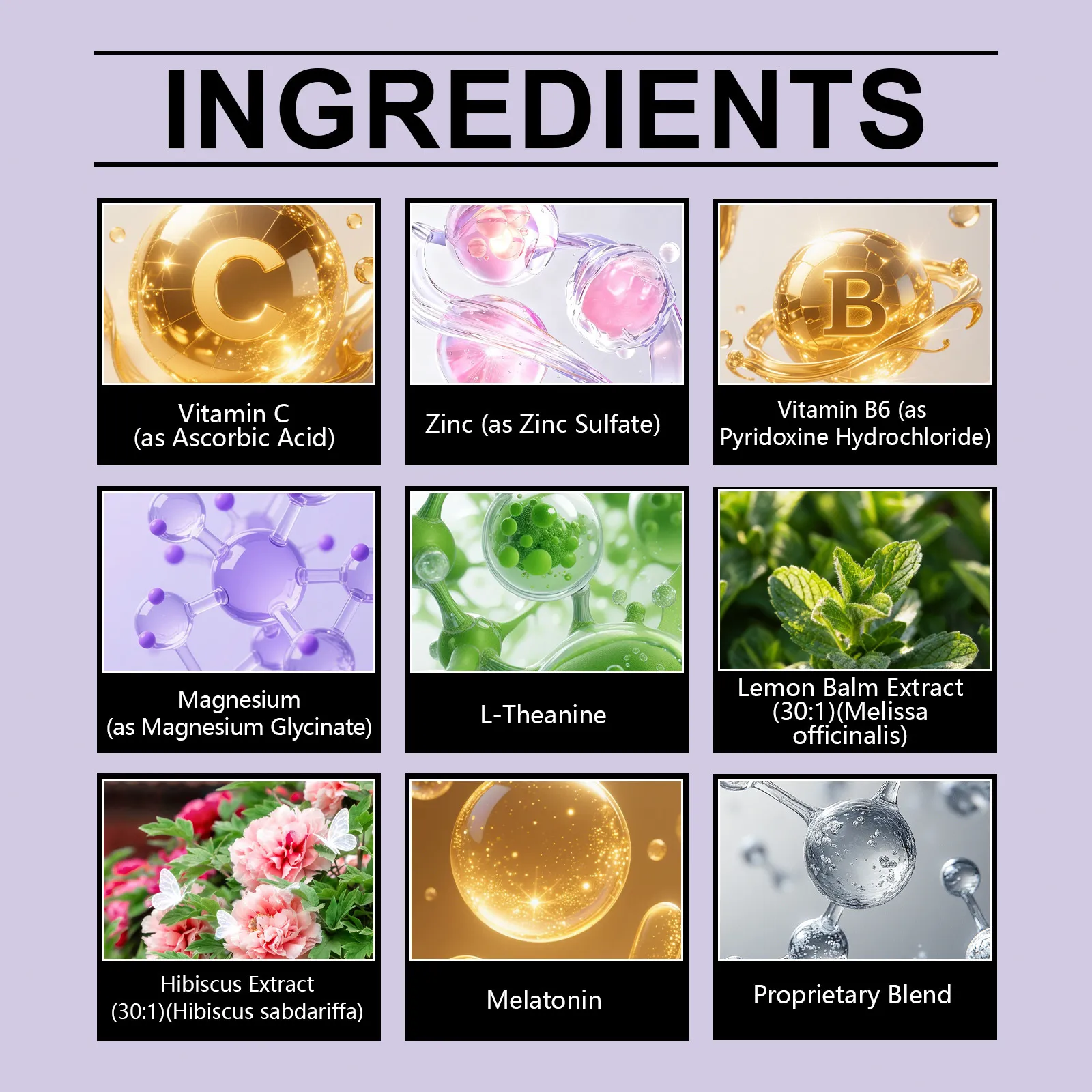 Comprehensive Night Formula: Combines melatonin, L-theanine, valerian root, lemon balm, hibiscus, magnesium, and vitamin B6.