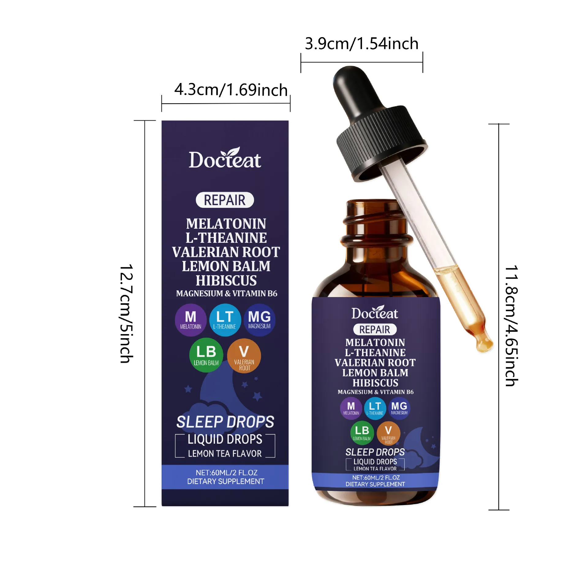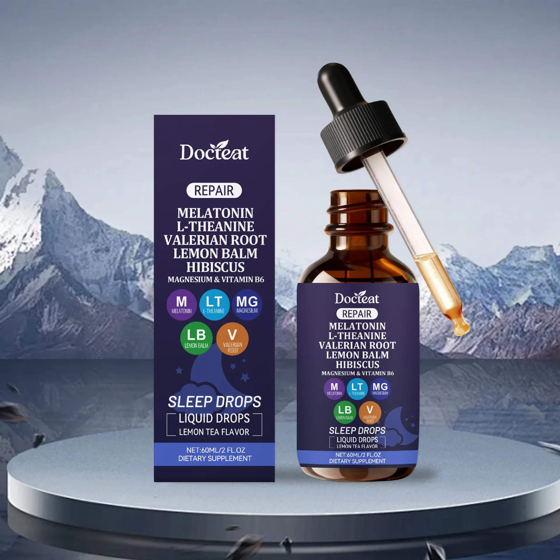 The Docteat Repair Sleep Drops Liquid Drops is a carefully structured dietary supplement presented in a 60ml amber glass dropper bottle for precise dosing and ingredient protection. This night-time formula combines botanical extracts, amino acids, minerals, and melatonin to support relaxation and healthy sleep cycles.
