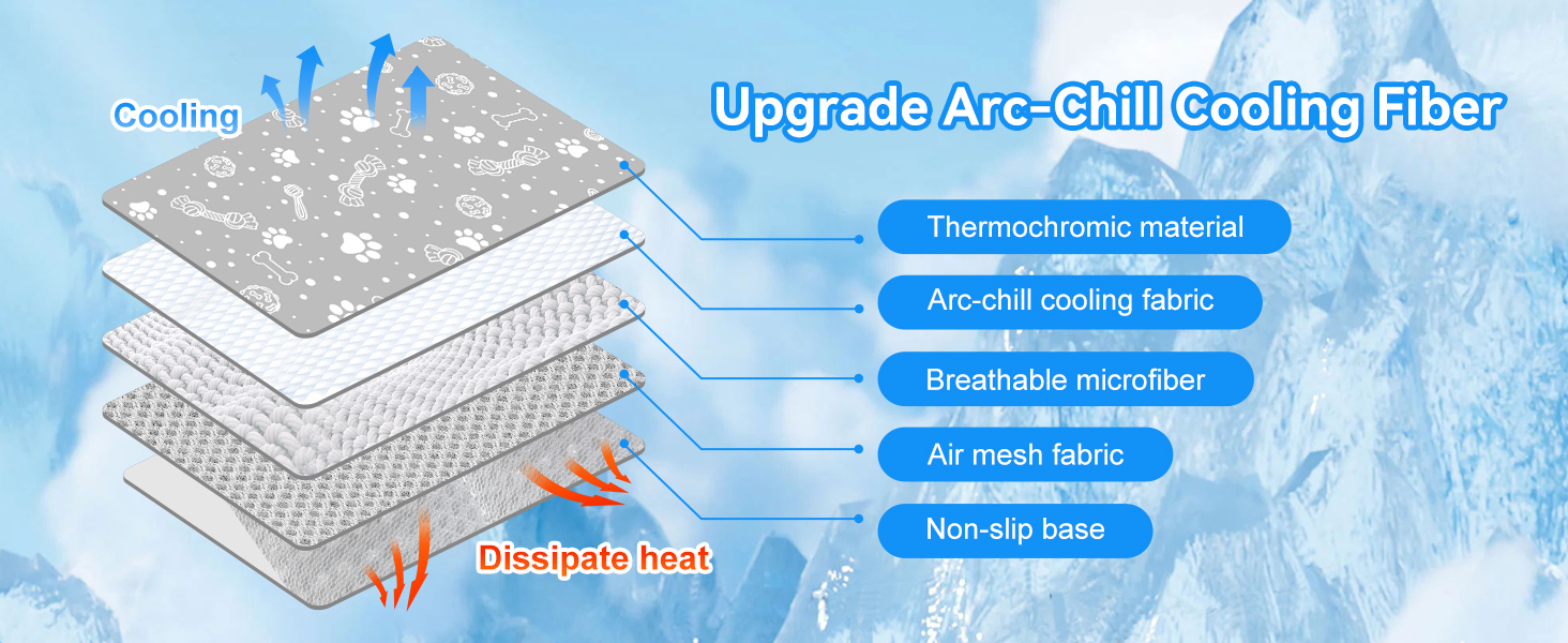 - ❄️UPGRADED SELF-COOLING DOG MAT: Utilizing the latest Arc-Chill self-cooling fabric, our dog cooling mat differs from others mat by requiring no water, electricity, or refrigeration. Simply lay your pet on the cool mat, and it absorbs their body heat, effectively lowering the temperature by 3-5°C (5-9°F). This helps prevent overheating and dehydration, offering a safe and effective way to cool your pet.