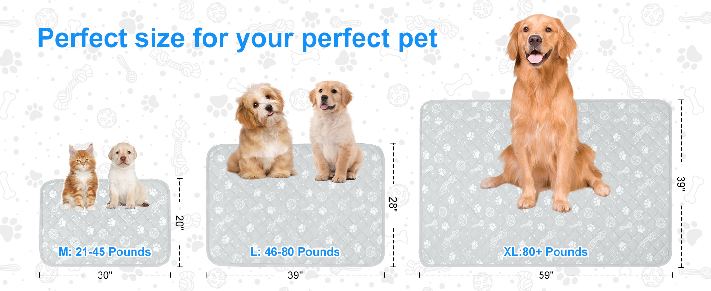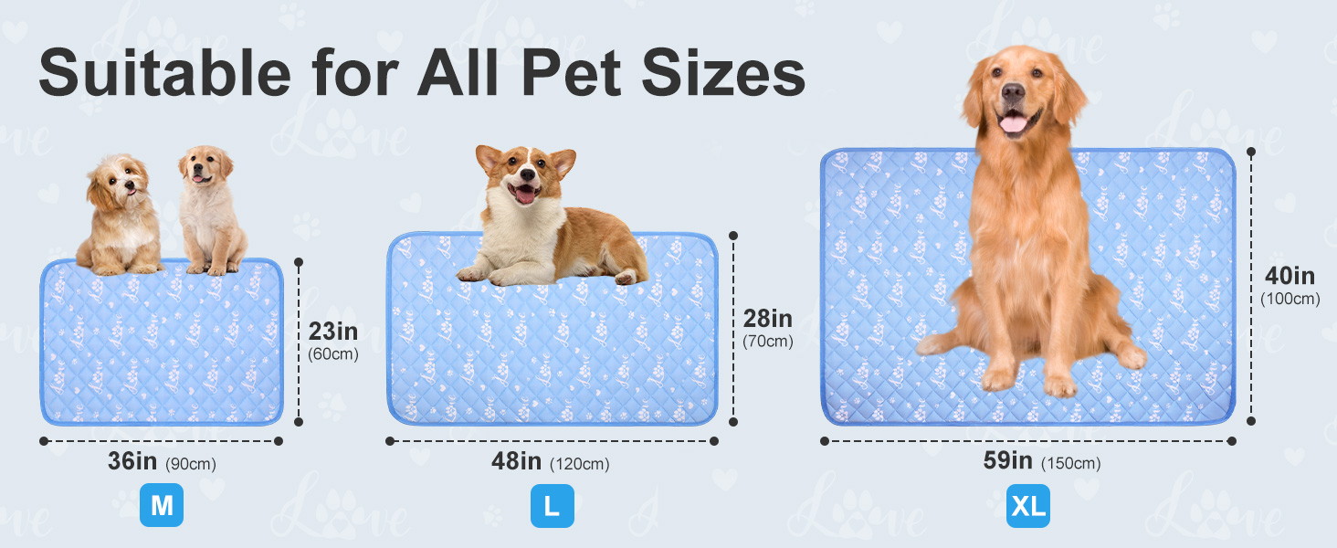 The dog cooling mat fits most pets and comes in three sizes for you to choose from (20" x 30", 28" x 39" and 39" x 59"). This is a must have cool blanket/pad for your pet in summer.