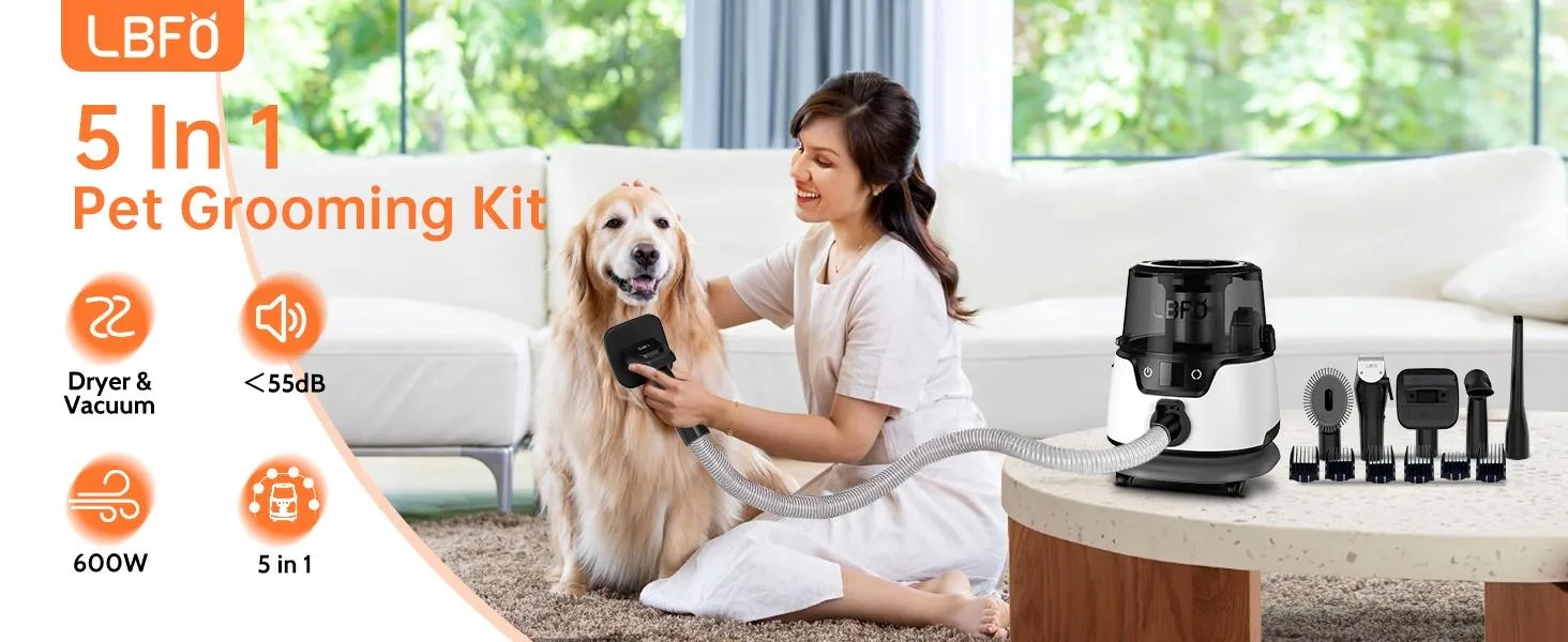 The Dog Grooming Vacuum and Dryer is an all-in-one grooming solution designed to make pet grooming easy and efficient. This powerful 600W grooming kit comes with six essential tools, including a low-noise pet hair vacuum, dog clippers, and a 3L dust cup, allowing you to groom, dry, and clean up pet hair all in one go. Whether you're tackling thick coats or simply trimming your pet's fur, this grooming kit offers everything you need for a professional grooming experience at home. The low noise design ensures that your pet stays calm and comfortable during the grooming process, reducing anxiety for both you and your furry friend.